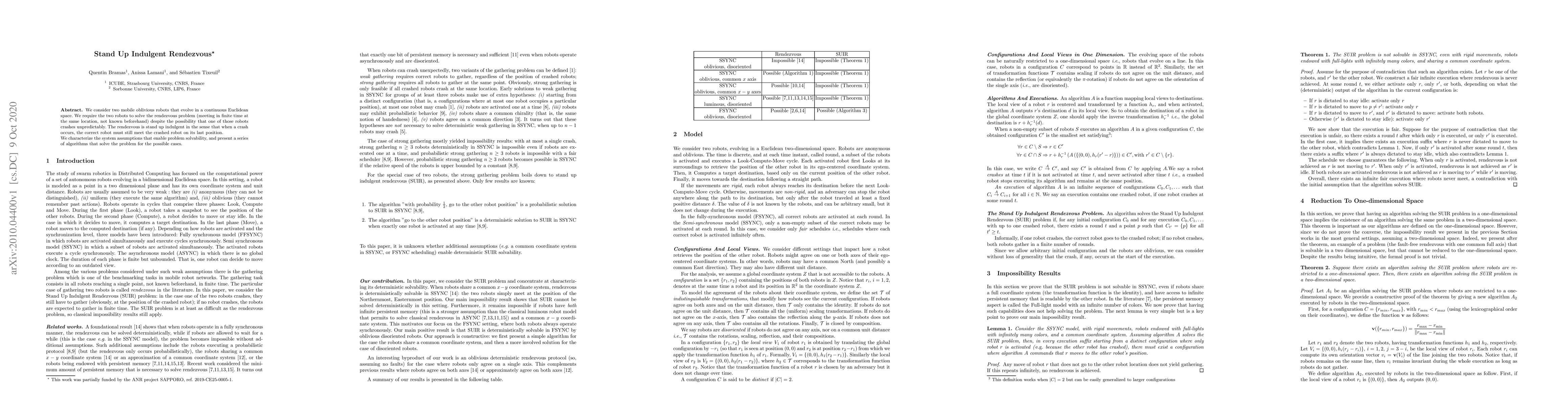 This paper explores the rendezvous problem for two mobile oblivious robots in an unpredictable environment, where one robot may crash. It presents algorithms that ensure the robots can meet even if a crash occurs, requiring the surviving robot to rendezvous at the last known position of the crashed one. The study characterizes the conditions under which such a "stand up indulgent" rendezvous is feasible.