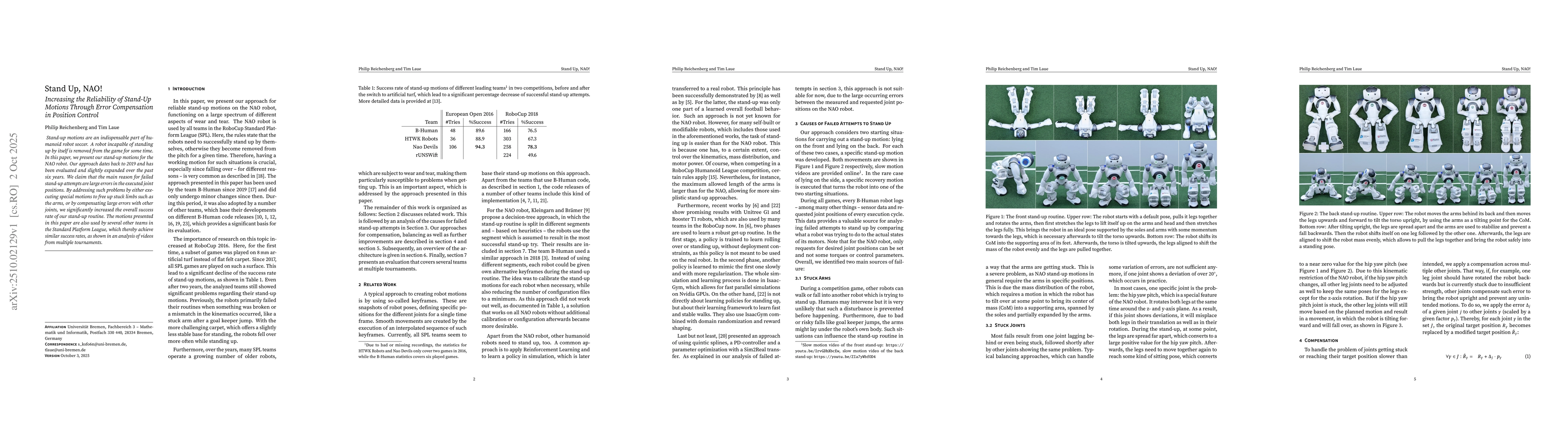 Stand-up motions are an indispensable part of humanoid robot soccer. A robot incapable of standing up by itself is removed from the game for some time. In this paper, we present our stand-up motions for the NAO robot. Our approach dates back to 2019 and has been evaluated and slightly expanded over the past six years. We claim that the main reason for failed stand-up attempts are large errors in the executed joint positions. By addressing such problems by either executing special motions to free up stuck limbs such as the arms, or by compensating large errors with other joints, we significantly increased the overall success rate of our stand-up routine. The motions presented in this paper are also used by several other teams in the Standard Platform League, which thereby achieve similar success rates, as shown in an analysis of videos from multiple tournaments.