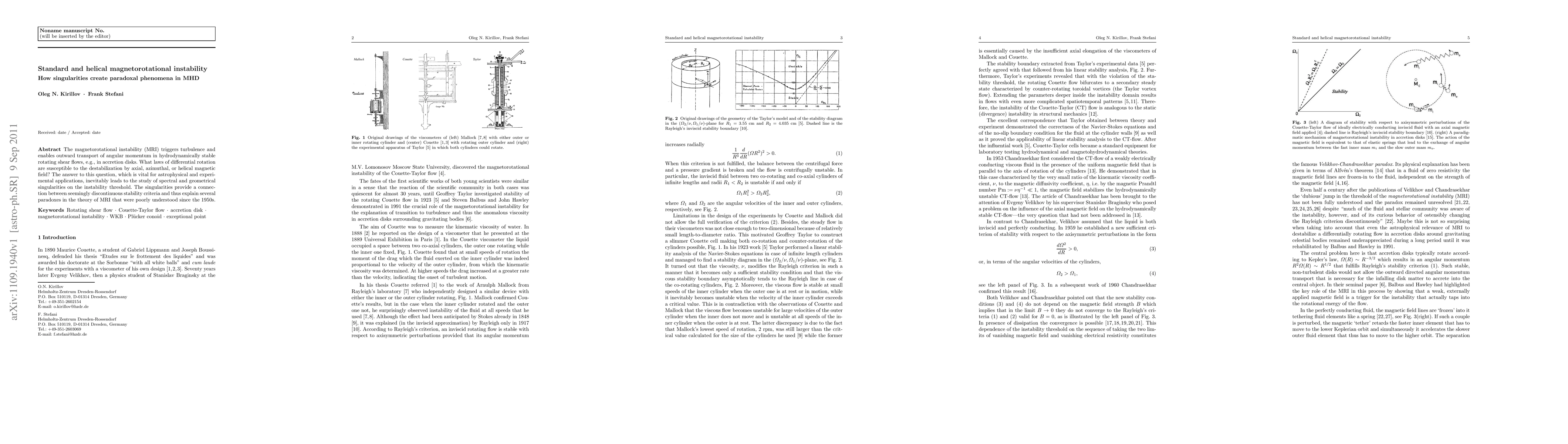 This paper investigates the magnetorotational instability (MRI) in rotating shear flows, focusing on how axial, azimuthal, or helical magnetic fields destabilize differential rotation. It reveals that singularities on the instability threshold explain paradoxical phenomena in MRI, bridging gaps in understanding that have persisted since the 1950s.