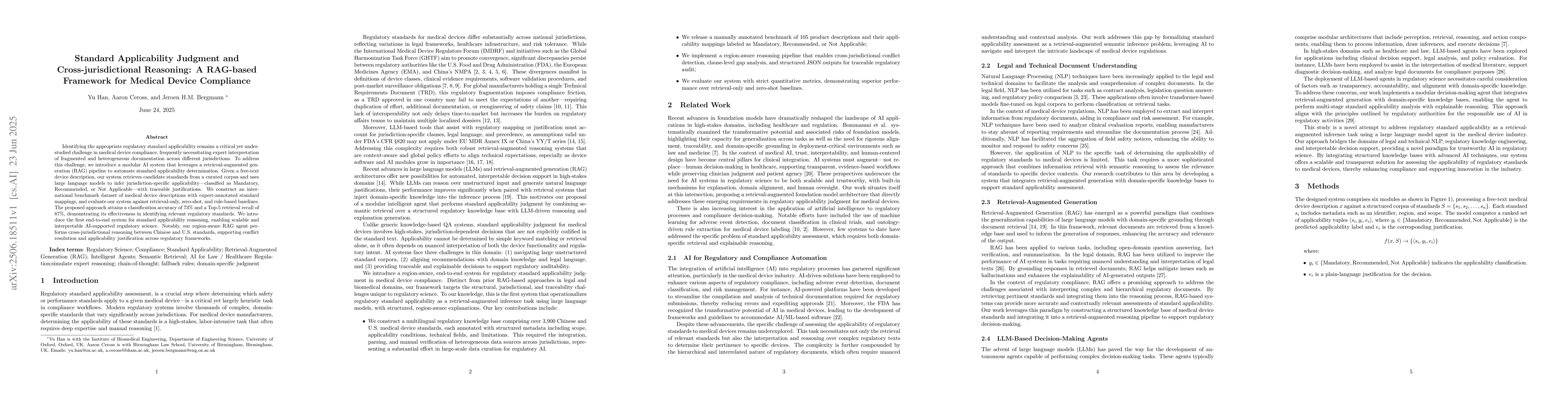 Identifying the appropriate regulatory standard applicability remains a critical yet understudied challenge in medical device compliance, frequently necessitating expert interpretation of fragmented and heterogeneous documentation across different jurisdictions. To address this challenge, we introduce a modular AI system that leverages a retrieval-augmented generation (RAG) pipeline to automate standard applicability determination. Given a free-text device description, our system retrieves candidate standards from a curated corpus and uses large language models to infer jurisdiction-specific applicability, classified as Mandatory, Recommended, or Not Applicable, with traceable justifications. We construct an international benchmark dataset of medical device descriptions with expert-annotated standard mappings, and evaluate our system against retrieval-only, zero-shot, and rule-based baselines. The proposed approach attains a classification accuracy of 73% and a Top-5 retrieval recall of 87%, demonstrating its effectiveness in identifying relevant regulatory standards. We introduce the first end-to-end system for standard applicability reasoning, enabling scalable and interpretable AI-supported regulatory science. Notably, our region-aware RAG agent performs cross-jurisdictional reasoning between Chinese and U.S. standards, supporting conflict resolution and applicability justification across regulatory frameworks.