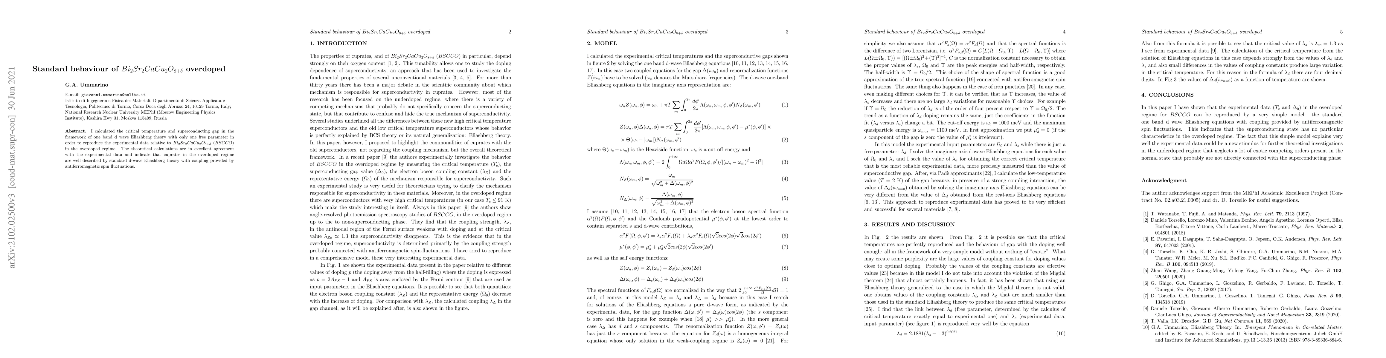This paper uses one-band d-wave Eliashberg theory to calculate the critical temperature and superconducting gap for overdoped BSCCO, finding excellent agreement with experimental data and confirming that standard d-wave theory with antiferromagnetic spin fluctuations accurately describes cuprates in this regime.
