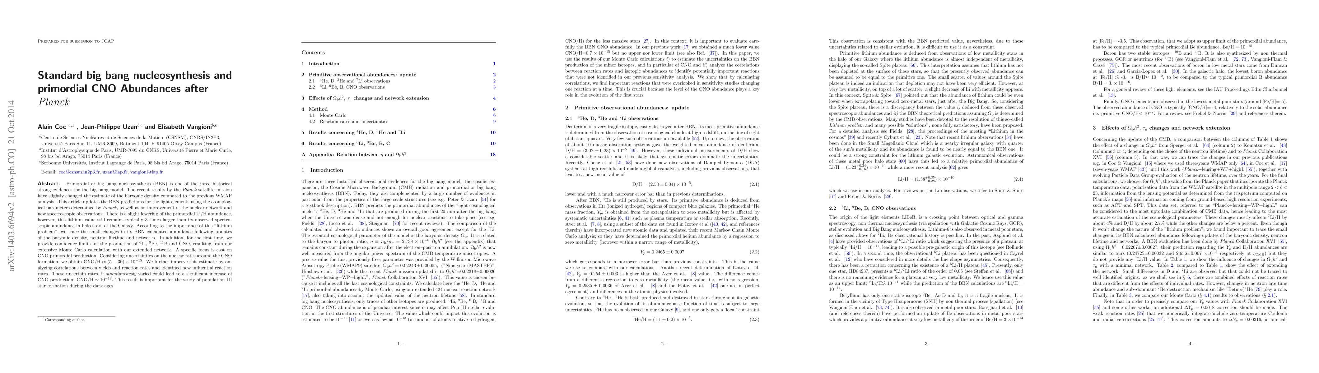 Primordial or big bang nucleosynthesis (BBN) is one of the three historical strong evidences for the big bang model. The recent results by the Planck satellite mission have slightly changed the estimate of the baryonic density compared to the previous WMAP analysis. This article updates the BBN predictions for the light elements using the cosmological parameters determined by Planck, as well as an improvement of the nuclear network and new spectroscopic observations. There is a slight lowering of the primordial Li/H abundance, however, this lithium value still remains typically 3 times larger than its observed spectroscopic abundance in halo stars of the Galaxy. According to the importance of this "lithium problem", we trace the small changes in its BBN calculated abundance following updates of the baryonic density, neutron lifetime and networks. In addition, for the first time, we provide confidence limits for the production of 6Li, 9Be, 11B and CNO, resulting from our extensive Monte Carlo calculation with our extended network. A specific focus is cast on CNO primordial production. Considering uncertainties on the nuclear rates around the CNO formation, we obtain CNO/H \approx (5-30) x 10^{-15}. We further improve this estimate by analyzing correlations between yields and reaction rates and identified new influential reaction rates. These uncertain rates, if simultaneously varied could lead to a significant increase of CNO production: CNO/H \sim 10^{-13}. This result is important for the study of population III star formation during the dark ages.
