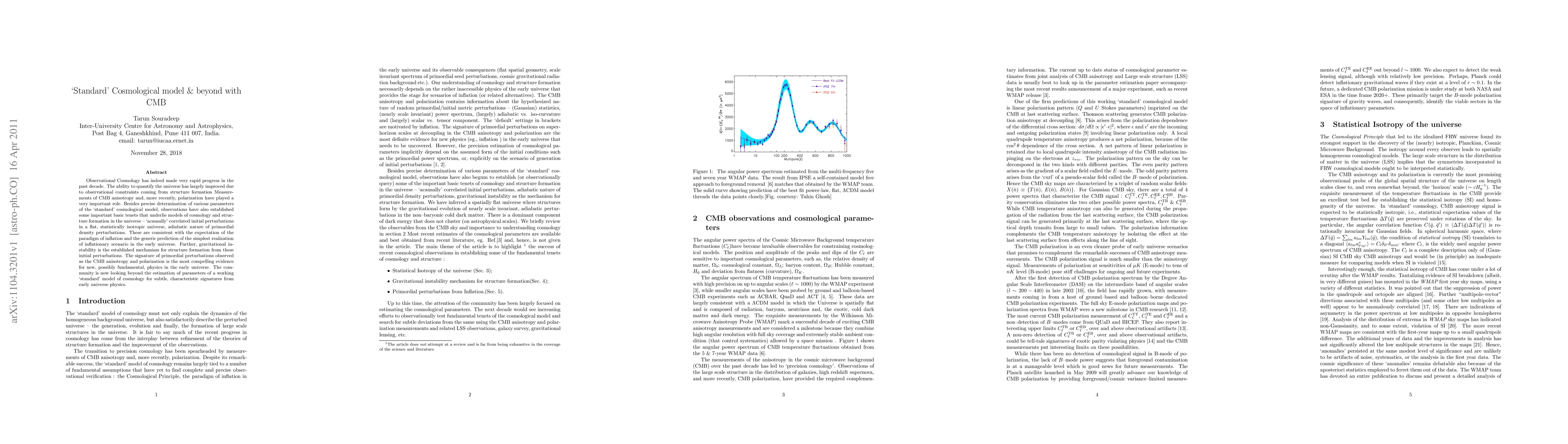 Observational Cosmology has indeed made very rapid progress in the past decade. The ability to quantify the universe has largely improved due to observational constraints coming from structure formation Measurements of CMB anisotropy and, more recently, polarization have played a very important role. Besides precise determination of various parameters of the `standard' cosmological model, observations have also established some important basic tenets that underlie models of cosmology and structure formation in the universe -- `acausally' correlated initial perturbations in a flat, statistically isotropic universe, adiabatic nature of primordial density perturbations. These are consistent with the expectation of the paradigm of inflation and the generic prediction of the simplest realization of inflationary scenario in the early universe. Further, gravitational instability is the established mechanism for structure formation from these initial perturbations. The signature of primordial perturbations observed as the CMB anisotropy and polarization is the most compelling evidence for new, possibly fundamental, physics in the early universe. The community is now looking beyond the estimation of parameters of a working `standard' model of cosmology for subtle, characteristic signatures from early universe physics.