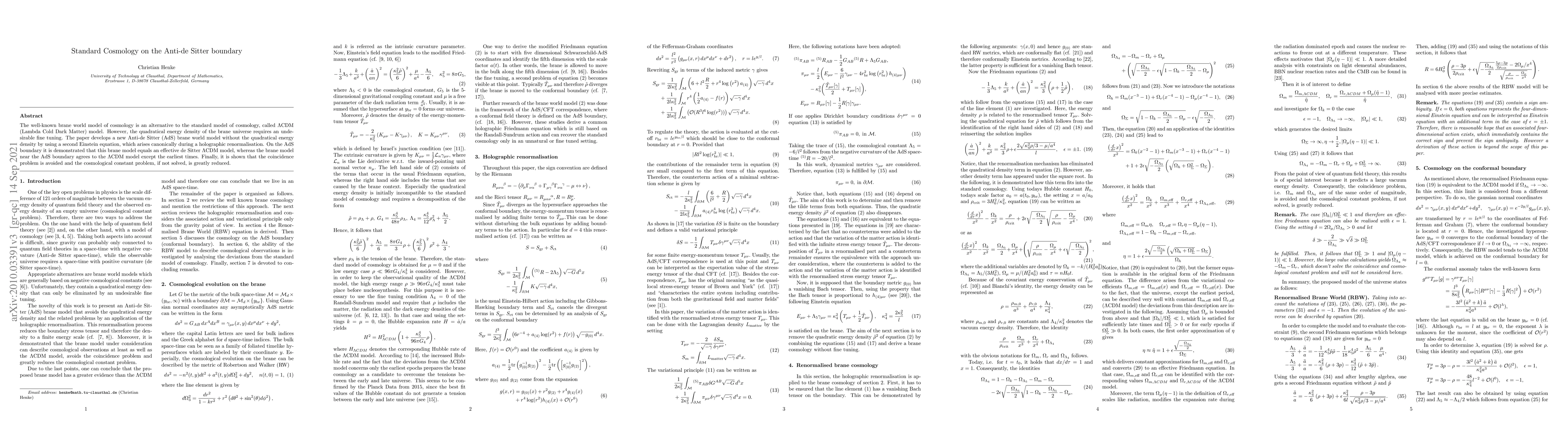 The well-known brane world model of cosmology is an alternative to the standard model of cosmology, called {\Lambda}CDM (Lambda Cold Dark Matter) model. However, the quadratical energy density of the brane universe requires an undesirable fine tuning. The paper develops a new Anti-de Sitter (AdS) brane world model without the quadratical energy density by using a second Einstein equation, which arises canonically during a holographic renormalisation. On the AdS boundary it is demonstrated that this brane model equals an effective de Sitter {\Lambda}CDM model, whereas the brane model near the AdS boundary agrees to the {\Lambda}CDM model except the earliest times. Finally, it is shown that the coincidence problem is avoided and the cosmological constant problem, if not solved, is greatly reduced.