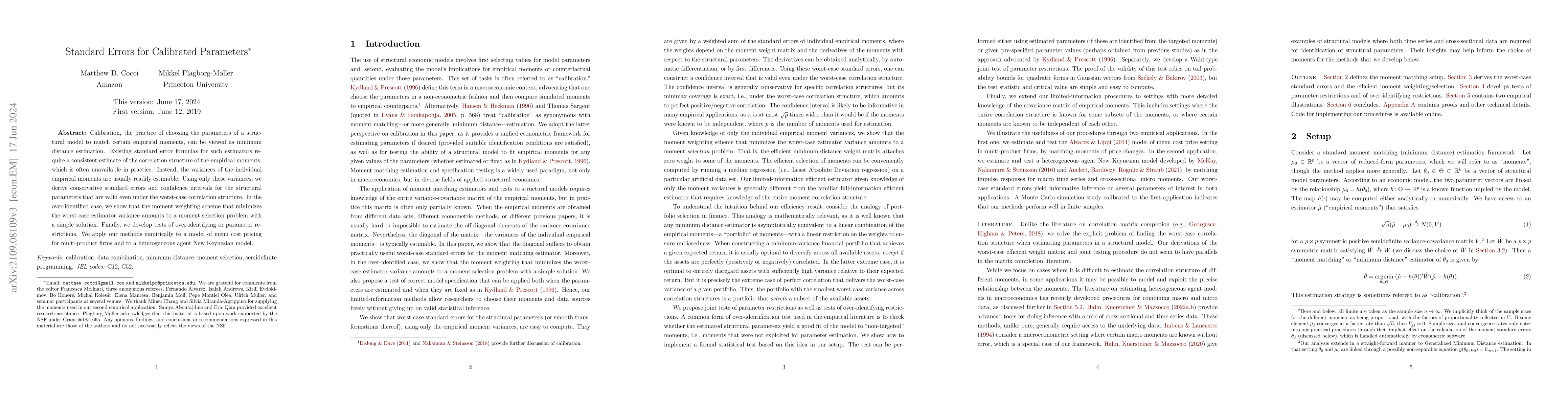 This paper proposes conservative standard error formulas for calibrated parameters in structural models using only estimable variances of empirical moments, ensuring validity under worst-case correlation scenarios. It also introduces a moment selection method and tests for over-identification, demonstrated through applications to menu cost pricing and a New Keynesian model.