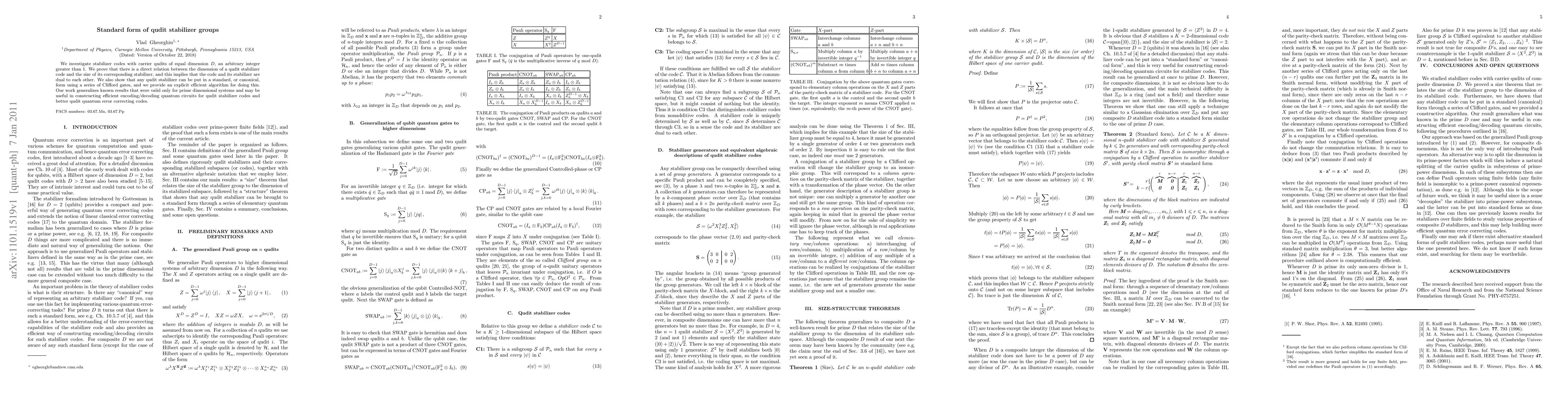 This paper investigates stabilizer codes for qudits of equal dimension $D$, proving a direct relation between code dimension and stabilizer size, and demonstrating that codes and stabilizers are dual. It introduces a standard form for qudit stabilizers using Clifford gates and provides an efficient algorithm for this transformation, generalizing previous results for prime dimensions.