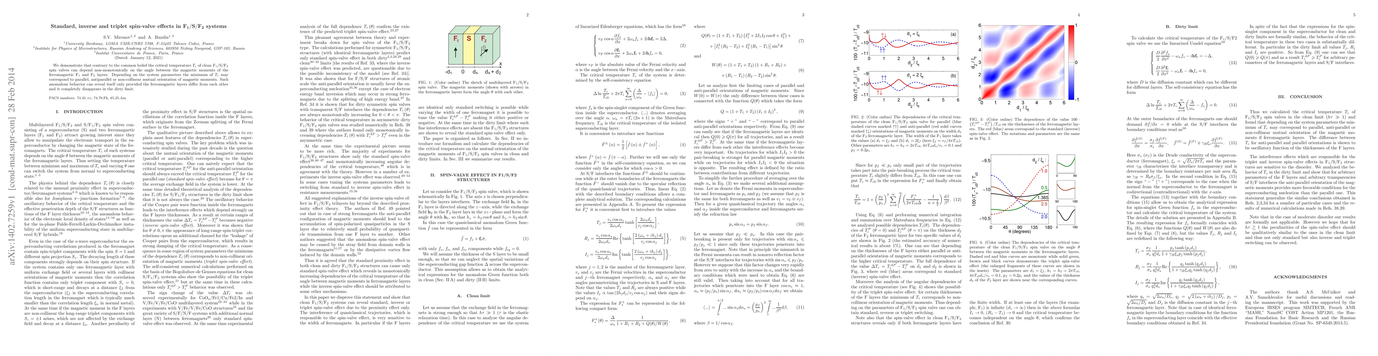 This work extends previous conclusions on spin-valve effects to encompass standard, inverse, and triplet switching in F1/S/F2 structures, providing a comprehensive understanding of how system parameters influence critical temperatures and superconducting behavior.