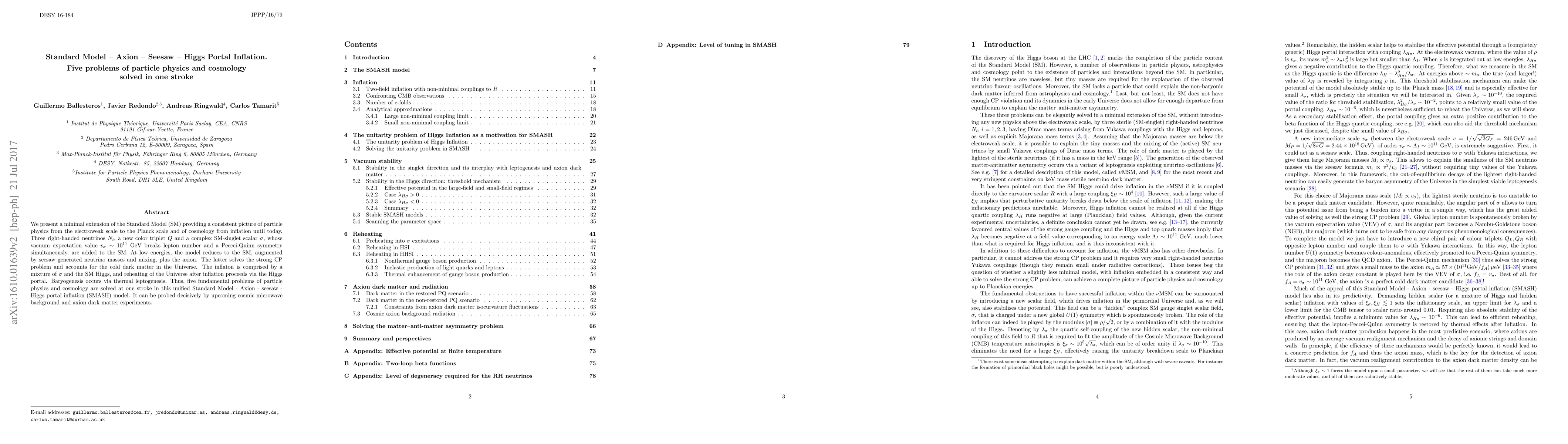 We present a minimal extension of the Standard Model (SM) providing a consistent picture of particle physics from the electroweak scale to the Planck scale and of cosmology from inflation until today. Three right-handed neutrinos $N_i$, a new color triplet $Q$ and a complex SM-singlet scalar $\sigma$, whose vacuum expectation value $v_\sigma \sim 10^{11}$ GeV breaks lepton number and a Peccei-Quinn symmetry simultaneously, are added to the SM. At low energies, the model reduces to the SM, augmented by seesaw generated neutrino masses and mixing, plus the axion. The latter solves the strong CP problem and accounts for the cold dark matter in the Universe. The inflaton is comprised by a mixture of $\sigma$ and the SM Higgs, and reheating of the Universe after inflation proceeds via the Higgs portal. Baryogenesis occurs via thermal leptogenesis. Thus, five fundamental problems of particle physics and cosmology are solved at one stroke in this unified Standard Model - Axion - seesaw - Higgs portal inflation (SMASH) model. It can be probed decisively by upcoming cosmic microwave background and axion dark matter experiments.