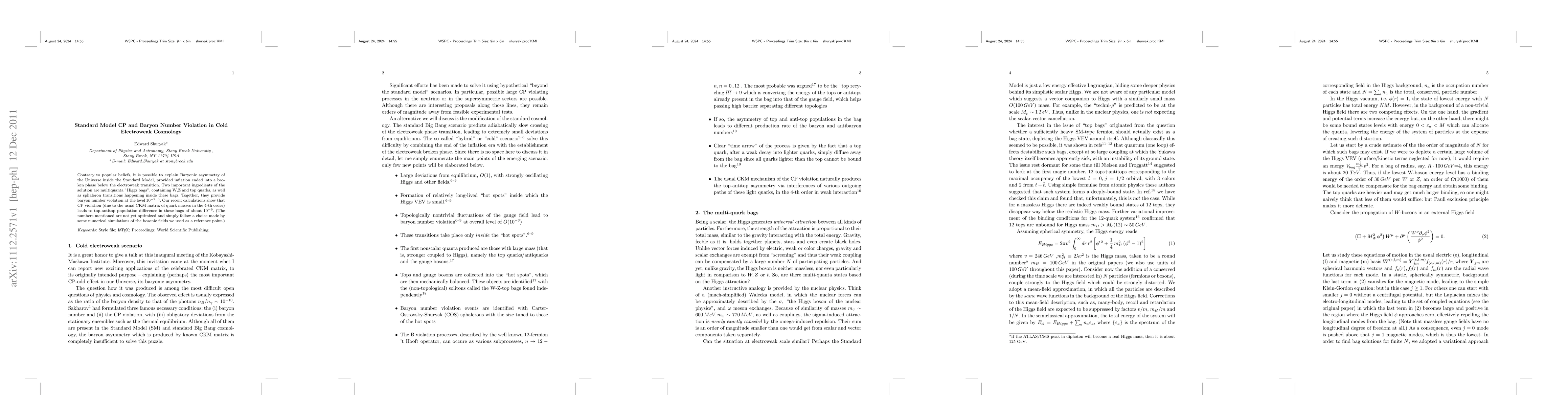 Contrary to popular beliefs, it is possible to explain Baryonic asymmetry of the Universe inside the Standard Model, provided inflation ended into a broken phase below the electroweak transition. Two important ingredients of the solution are multiquanta "Higgs bags", containing W,Z and top quarks, as well as sphaleron transitions happening inside these bags. Together, they provide baryon number violation at the level $10^{-2..3}$. Our recent calculations show that CP violation (due to the usual CKM matrix of quark masses in the 4-th order) leads to top-antitop population difference in these bags of about $10^{-9}$. (The numbers mentioned are not yet optimized and simply follow a choice made by some numerical simulations of the bosonic fields we used as a reference point.)
