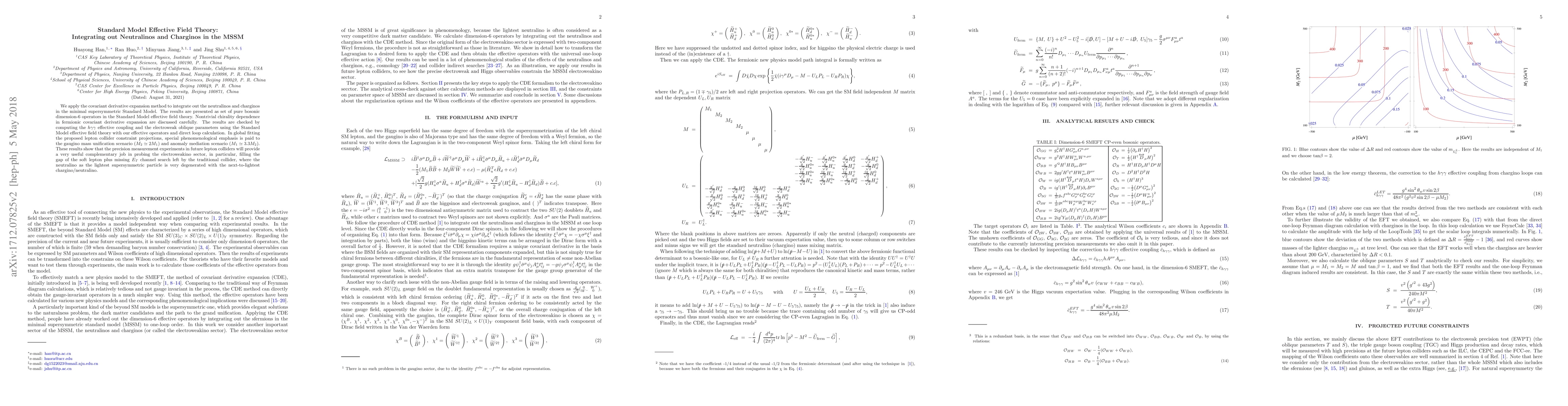 We apply the covariant derivative expansion method to integrate out the neutralinos and charginos in the minimal supersymmetric Standard Model. The results are presented as set of pure bosonic dimension-6 operators in the Standard Model effective field theory. Nontrivial chirality dependence in fermionic covariant derivative expansion are discussed carefully. The results are checked by computing the $h\gamma\gamma$ effective coupling and the electroweak oblique parameters using the Standard Model effective field theory with our effective operators and direct loop calculation. In global fitting the proposed lepton collider constraint projections, special phenomenological emphasis is paid to the gaugino mass unification scenario ($M_2\simeq2M_1$) and anomaly mediation scenario ($M_1\simeq3.3M_2$). These results show that the precision measurement experiments in future lepton colliders will provide a very useful complementary job in probing the electroweakino sector, in particular, filling the gap of the soft lepton plus missing $E_T$ channel search left by the traditional collider, where the neutralino as the lightest supersymmetric particle is very degenerated with the next-to-lightest chargino/neutralino.