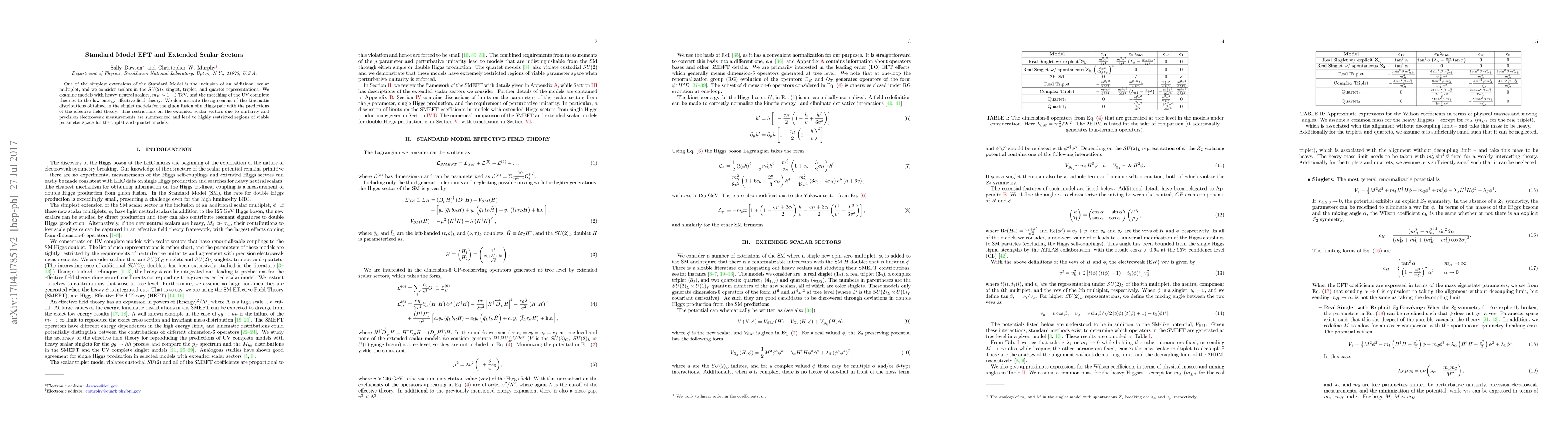One of the simplest extensions of the Standard Model is the inclusion of an additional scalar multiplet, and we consider scalars in the $SU(2)_L$ singlet, triplet, and quartet representations. We examine models with heavy neutral scalars, $m_H\sim 1-2$ TeV, and the matching of the UV complete theories to the low energy effective field theory. We demonstrate the agreement of the kinematic distributions obtained in the singlet models for the gluon fusion of a Higgs pair with the predictions of the effective field theory. The restrictions on the extended scalar sectors due to unitarity and precision electroweak measurements are summarized and lead to highly restricted regions of viable parameter space for the triplet and quartet models.