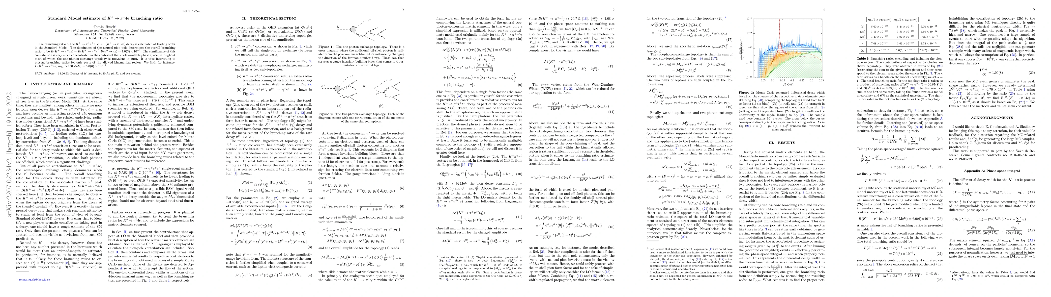 This paper calculates the branching ratio for the rare decay $K^+\to\pi^+4e$ within the Standard Model, finding it to be approximately $7.0(3)\times10^{-6}$. It also highlights the significance of the neutral-pion pole and presents a smaller branching ratio for a restricted kinematic region, specifically $B(K^+\to\pi^+4e,\,m_{4e}>150\,\text{MeV})=6.0(6)\times10^{-11}$.