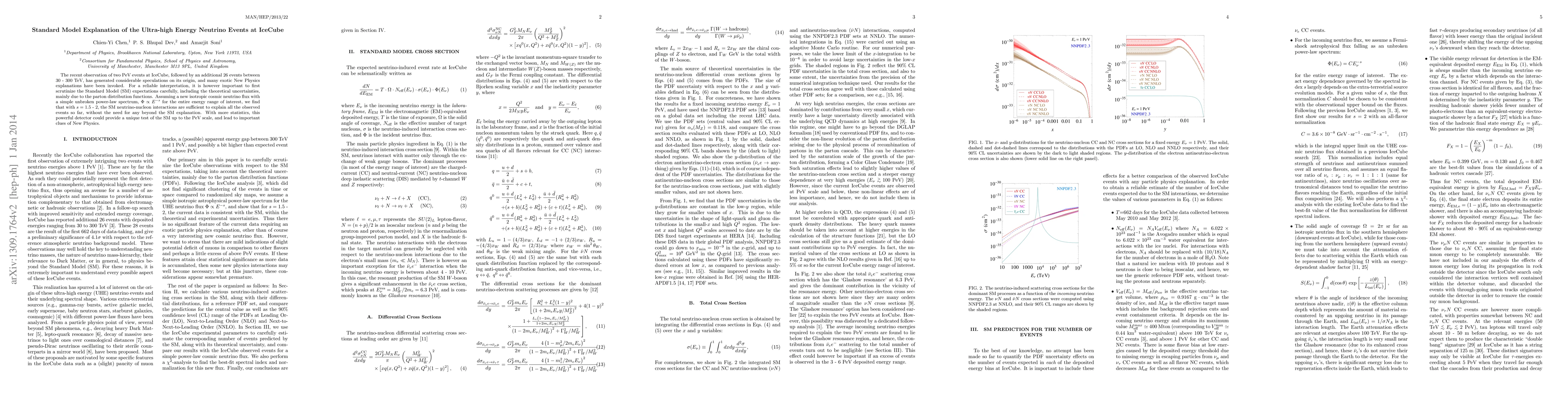 The recent observation of two PeV events at IceCube, followed by an additional 26 events between 30 - 300 TeV, has generated considerable speculations on its origin, and many exotic New Physics explanations have been invoked. For a reliable interpretation, it is however important to first scrutinize the Standard Model (SM) expectations carefully, including the theoretical uncertainties, mainly due to the parton distribution functions. Assuming a new isotropic cosmic neutrino flux with a simple unbroken power-law spectrum, $\Phi\propto E^{-s}$ for the entire energy range of interest, we find that with $s=1.5$ - 2, the SM neutrino-nucleon interactions are sufficient to explain all the observed events so far, without the need for any beyond the SM explanation. With more statistics, this powerful detector could provide a unique test of the SM up to the PeV scale, and lead to important clues of New Physics.