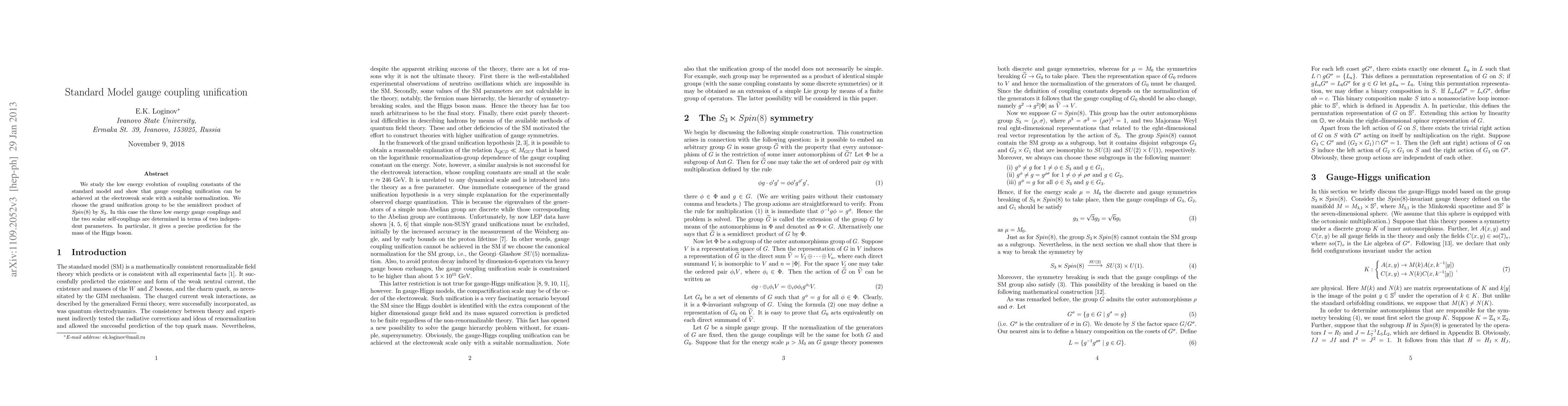This paper investigates the unification of the Standard Model's gauge coupling constants at the electroweak scale, demonstrating that it can be achieved using the semidirect product of Spin(8) by S_3 as the grand unification group. The model precisely predicts the Higgs boson mass based on two independent parameters.