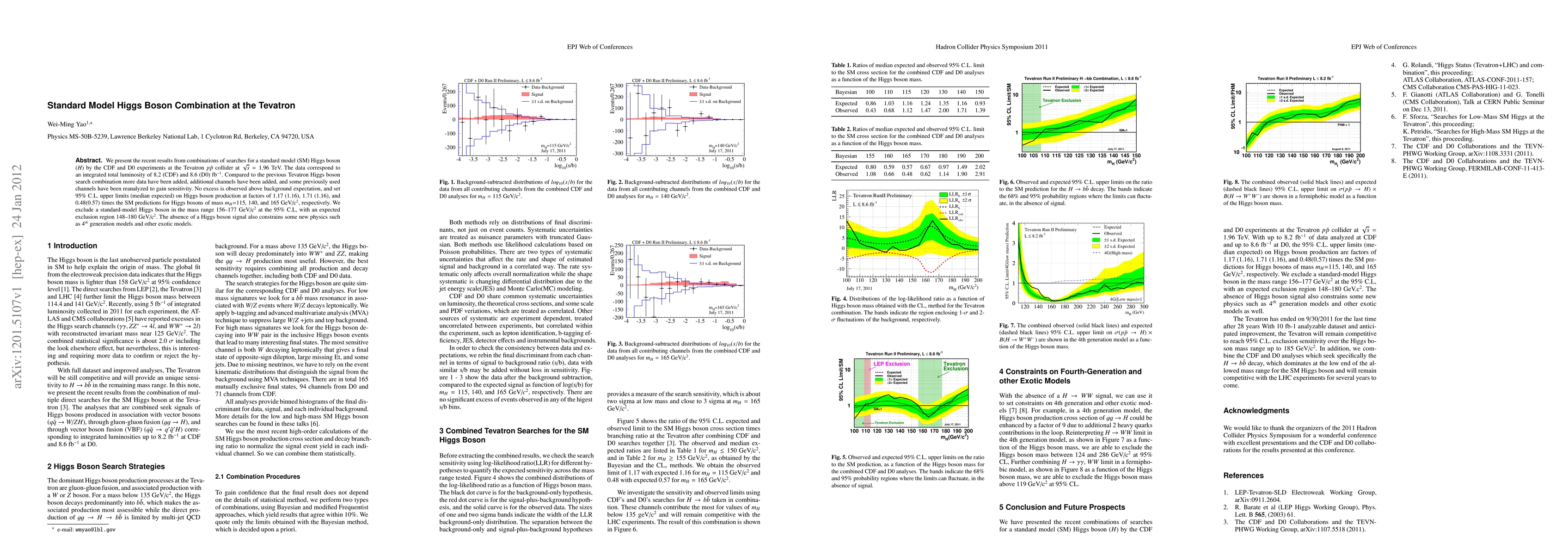 This paper combines recent results from the CDF and D0 experiments at the Tevatron, analyzing data up to 8.6 fb$^{-1}$ to search for a standard model Higgs boson. No significant excess is observed, leading to upper limits on Higgs boson production and exclusion of a Higgs boson in the mass range of 156--177 GeV/c$^2$ at 95% confidence level.