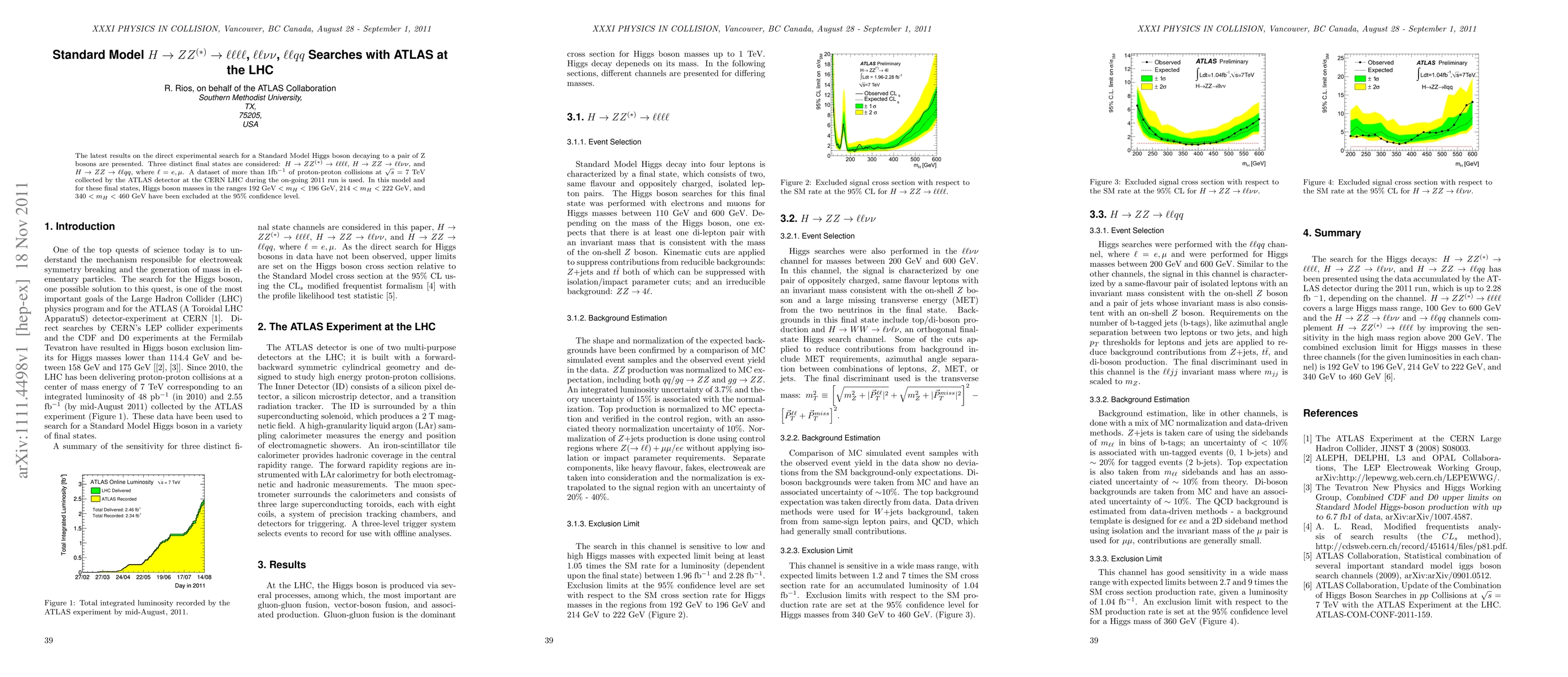 This paper presents results from the ATLAS experiment at the LHC on searches for a Standard Model Higgs boson decaying into pairs of Z bosons, focusing on three final states: $\ell\ell\ell\ell$, $\ell\ell\nu\nu$, and $\ell\ell qq$. The study excludes Higgs boson masses in specified ranges at the 95% confidence level using data from 2011.