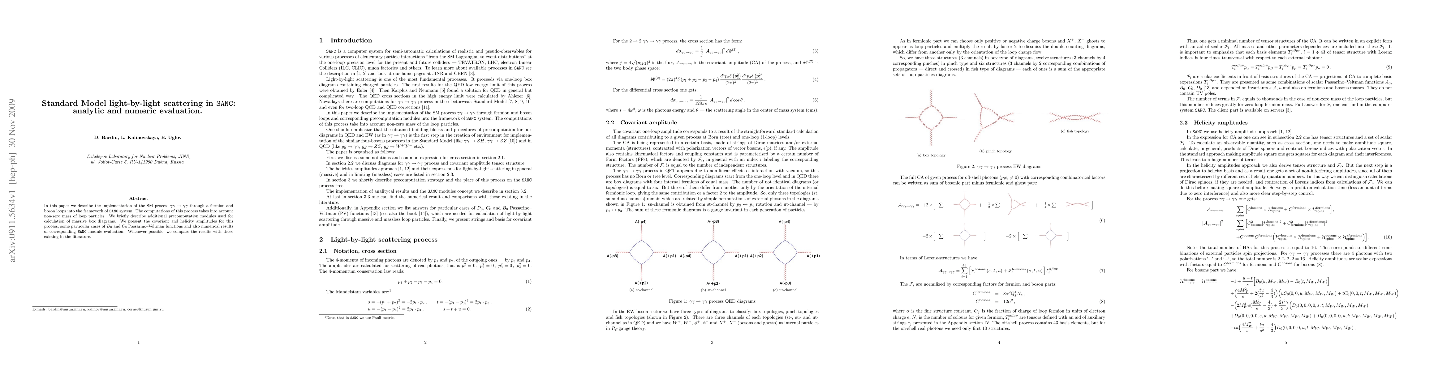 This paper evaluates the Standard Model light-by-light scattering process through fermion and boson loops in the SANC framework, providing analytic and numeric results.