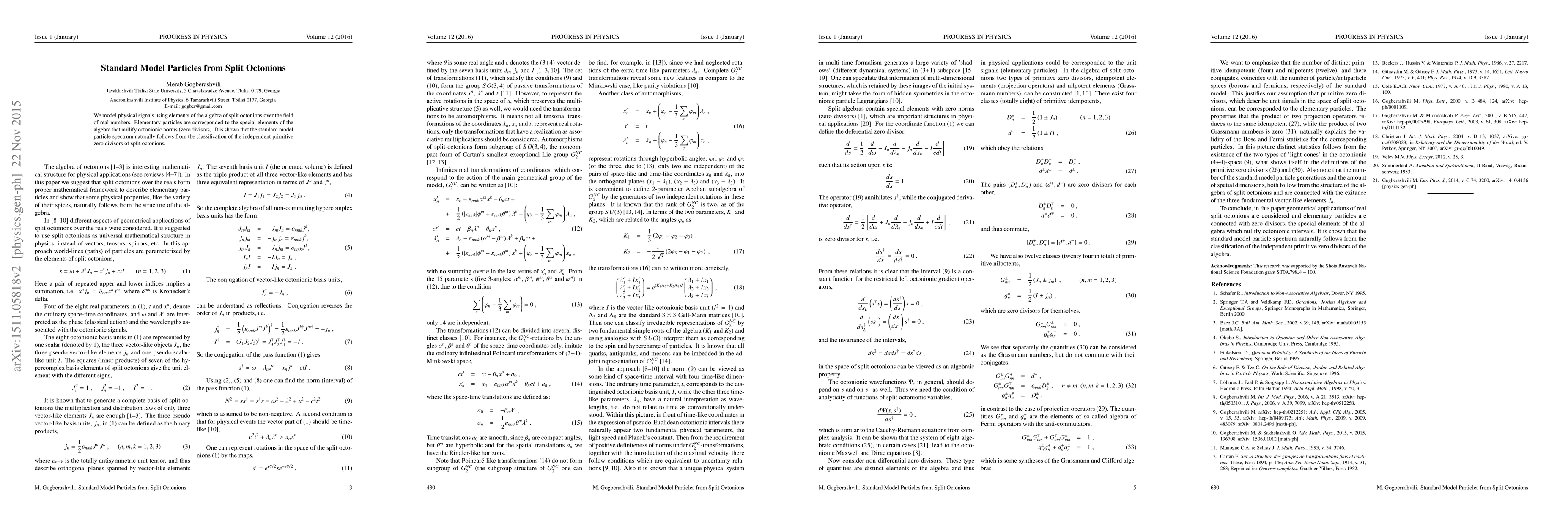 We model physical signals using elements of the algebra of split octonions over the field of real numbers. Elementary particles are corresponded to the special elements of the algebra that nullify octonionic norms (zero divisors). It is shown that the standard model particle spectrum naturally follows from the classification of the independent primitive zero divisors of split octonions.