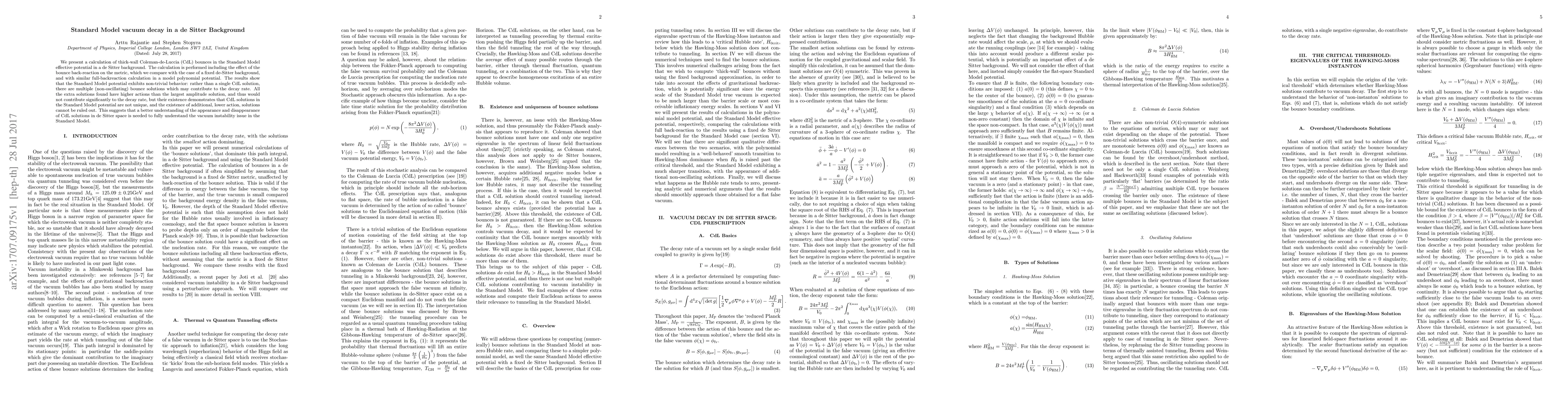 This paper investigates thick-wall Coleman-de-Luccia bounces in the Standard Model potential within a de Sitter background, revealing multiple non-oscillating bounce solutions that contribute to vacuum decay. Although additional solutions have higher actions, their existence suggests that further solutions with lower actions might exist, necessitating deeper exploration into vacuum instability in the Standard Model.