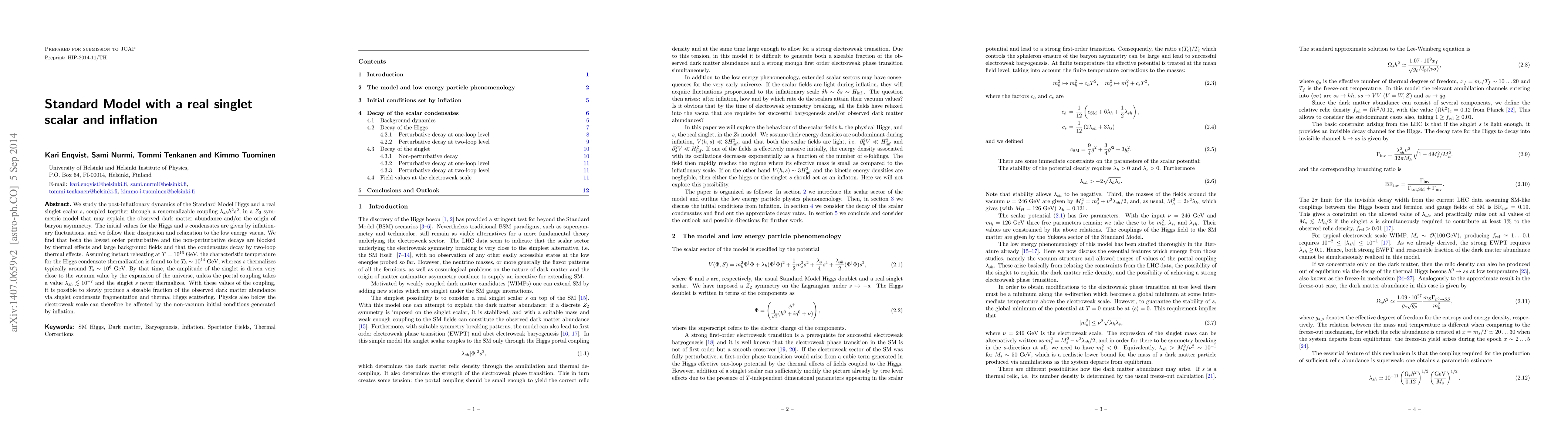 This paper explores a Standard Model extension with a real singlet scalar that may explain dark matter abundance and baryon asymmetry. It finds that the singlet condensate decays via two-loop thermal effects, with characteristic temperatures of 10^14 GeV for Higgs and 10^6 GeV for singlet.