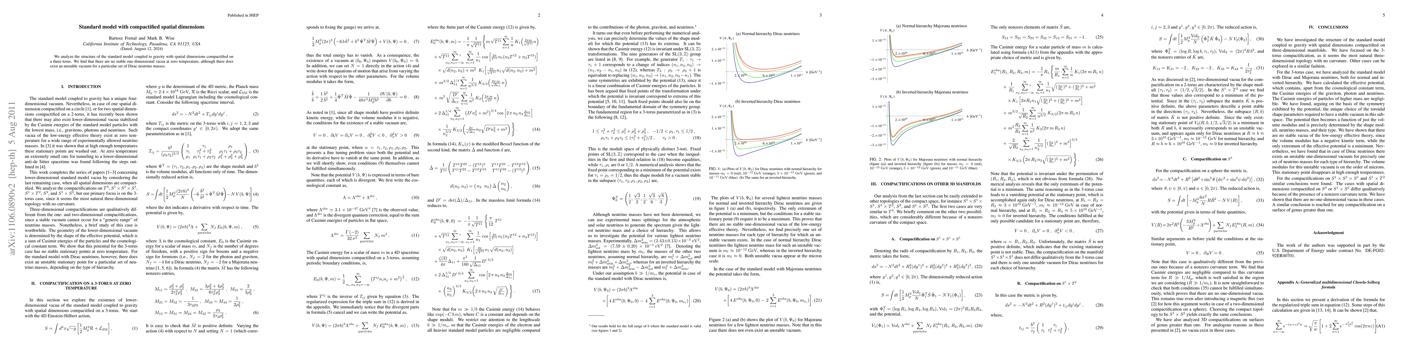 This paper examines the standard model integrated with gravity when spatial dimensions are compactified on a three-torus, revealing no stable vacua at zero temperature, but an unstable vacuum emerges under specific Dirac neutrino mass conditions.