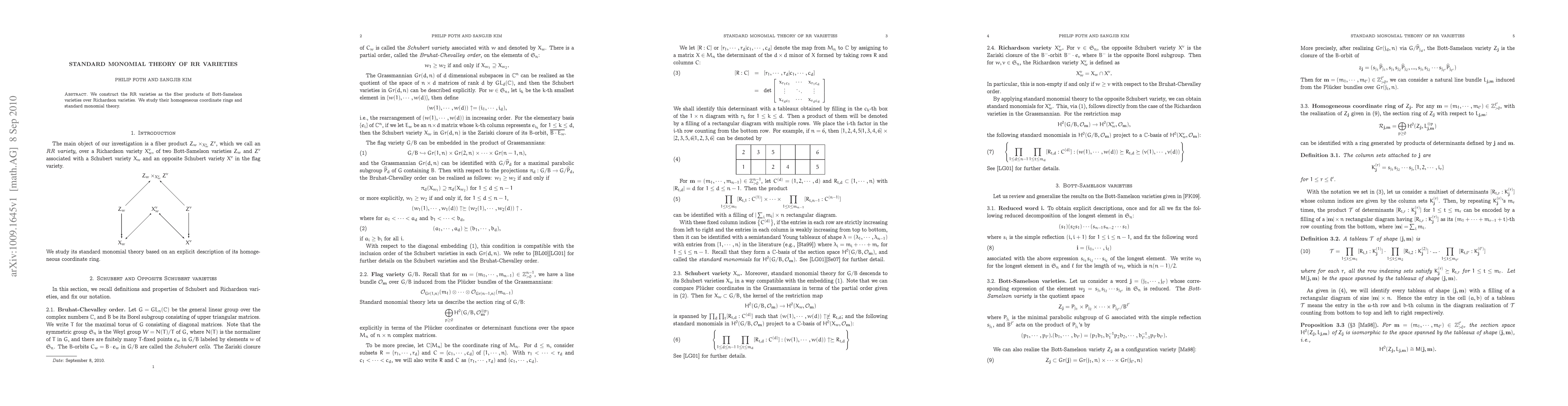 The paper constructs RR varieties via fiber products of Bott-Samelson and Richardson varieties, and investigates their homogeneous coordinate rings and standard monomial theory. This work aims to deepen the understanding of the algebraic structures underlying these varieties.
