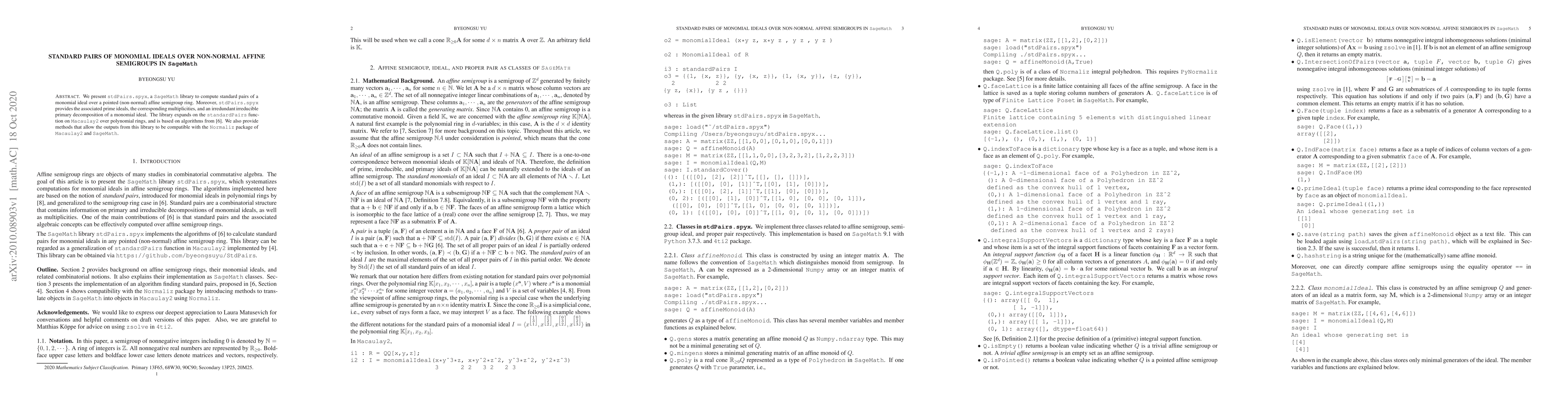 A new library in SageMath calculates standard pairs of monomial ideals over non-normal affine semigroups, providing associated prime ideals and irreducible primary decompositions.