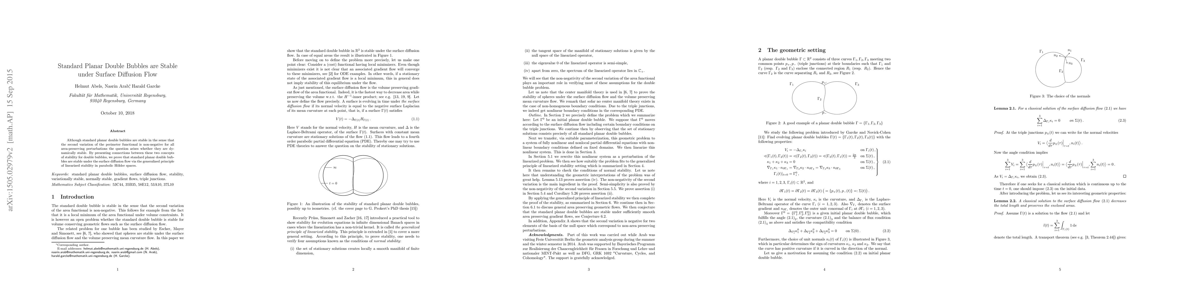 Although standard planar double bubbles are stable in the sense that the second variation of the perimeter functional is non-negative for all area-preserving perturbations the question arises whether they are dynamically stable. By presenting connections between these two concepts of stability for double bubbles, we prove that standard planar double bubbles are stable under the surface diffusion flow via the generalized principle of linearized stability in parabolic H\"older spaces.