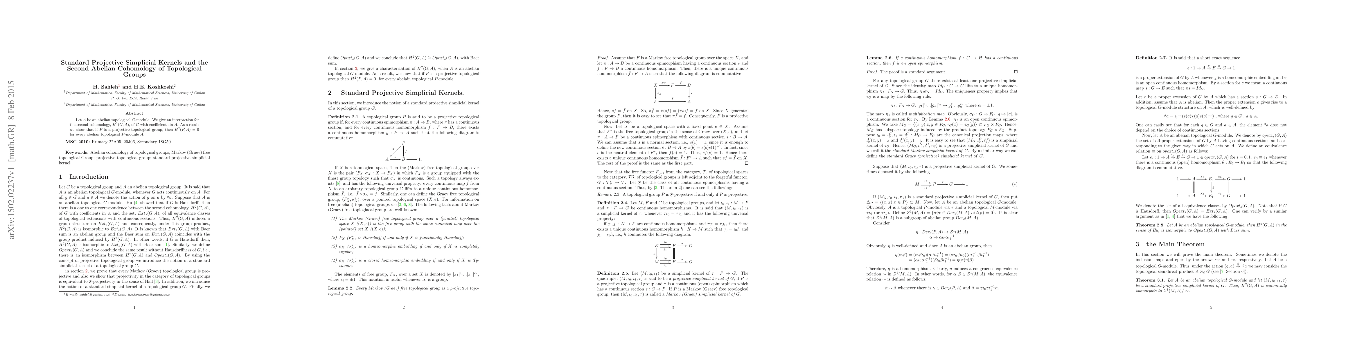 Let $A$ be an abelian topological $G$-module. We give an interpretion for the second cohomology, $H^{2}(G,A)$, of $G$ with coefficients in $A$. As a result we show that if $P$ is a projective topological group, then $H^{2}(P,A)=0$ for every abelian topological $P$-module $A$.