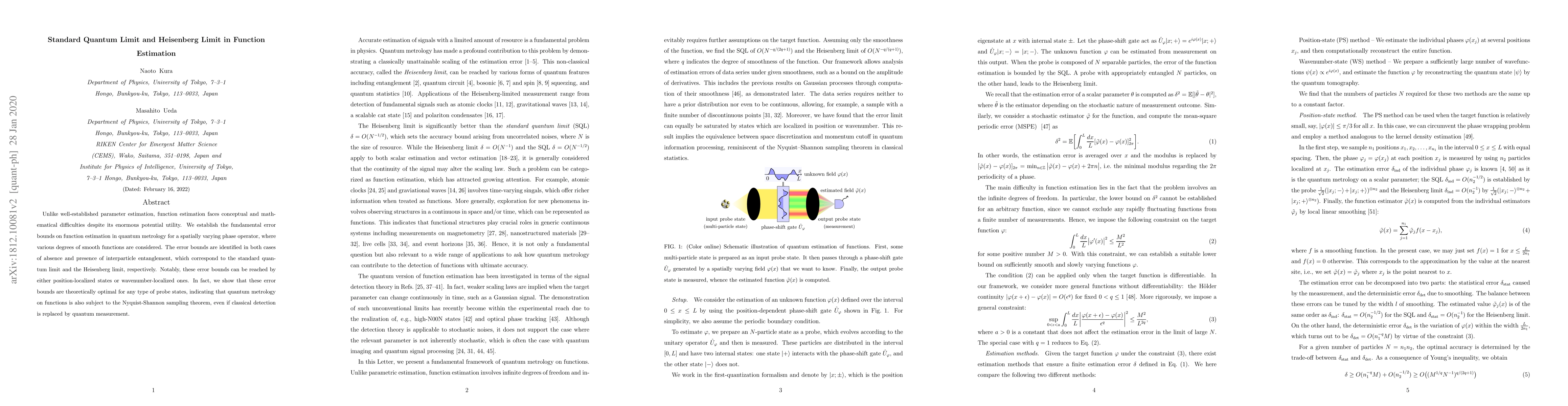 This paper establishes fundamental error bounds for quantum function estimation, identifying the standard quantum limit and Heisenberg limit under different conditions. It shows that optimal error bounds can be achieved by both position-localized and wavenumber-localized states, indicating adherence to the Nyquist-Shannon sampling theorem in quantum metrology.