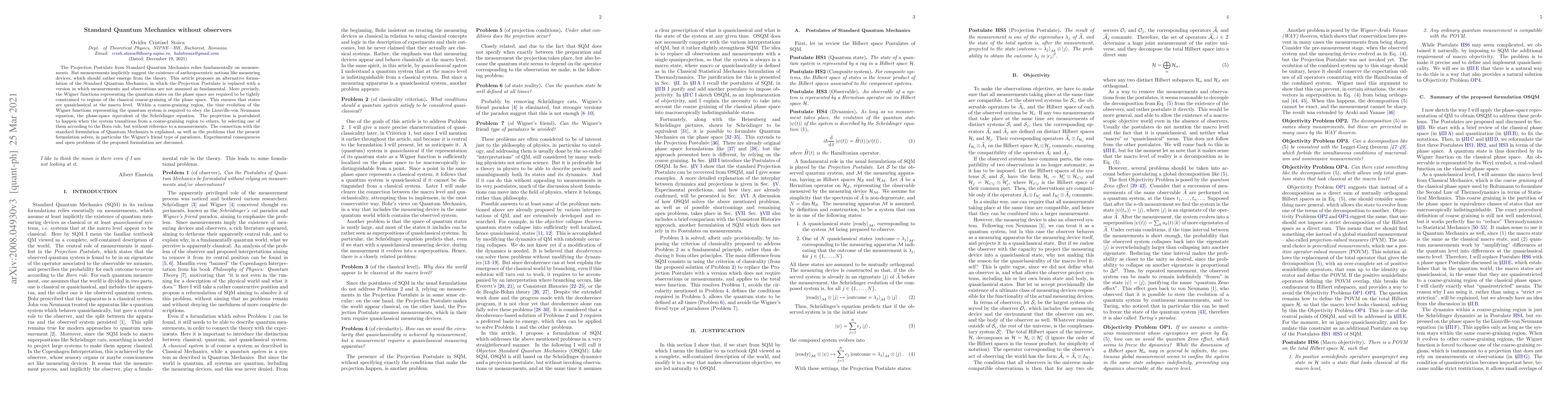 The Projection Postulate from Standard Quantum Mechanics relies fundamentally on measurements. But measurements implicitly suggest the existence of anthropocentric notions like measuring devices, which should rather emerge from the theory. This article proposes an alternative formulation of the Standard Quantum Mechanics, in which the Projection Postulate is replaced with a version in which measurements and observations are not assumed as fundamental. More precisely, the Wigner functions representing the quantum states on the phase space are required to be tightly constrained to regions of the classical coarse-graining of the phase space. This ensures that states are quasiclassical at the macro level. Within a coarse-graining region, the time evolution of the Wigner functions representing the quantum system is required to obey the Liouville-von Neumann equation, the phase-space equivalent of the Schr\"odinger equation. The projection is postulated to happen when the system transitions from a coarse-graining region to others, by selecting one of them according to the Born rule, but without reference to a measurements. The connection with the standard formulation of Quantum Mechanics is explained, as well as the problems that the present formulation solves, in particular the Wigner's friend type of paradoxes. Experimental consequences and open problems of the proposed formulation are discussed.