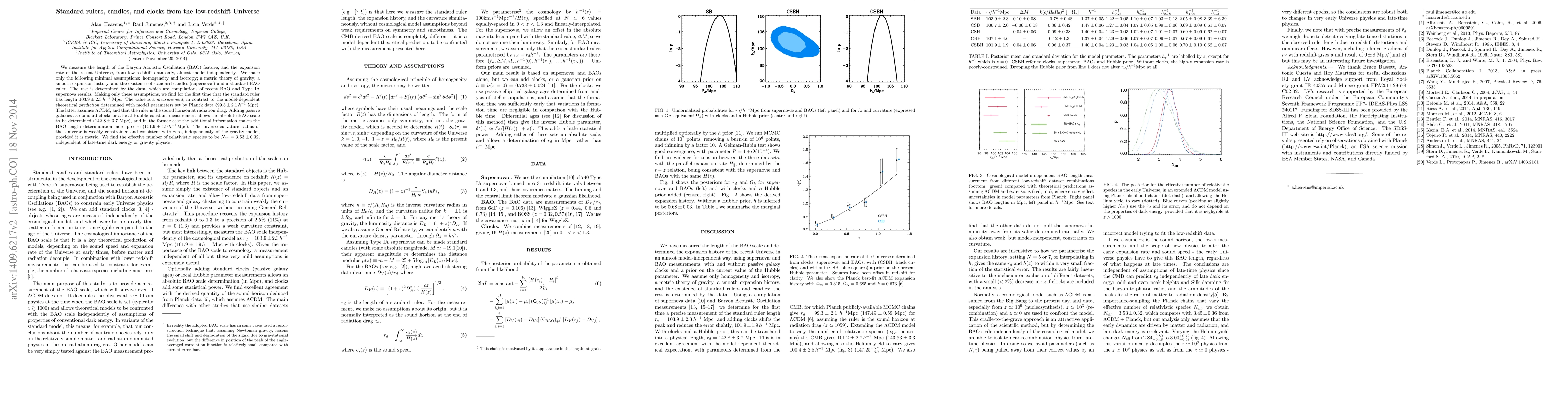 We measure the length of the Baryon Acoustic Oscillation (BAO) feature, and the expansion rate of the recent Universe, from low-redshift data only, almost model-independently. We make only the following minimal assumptions: homogeneity and isotropy; a metric theory of gravity; a smooth expansion history, and the existence of standard candles (supernov\ae) and a standard BAO ruler. The rest is determined by the data, which are compilations of recent BAO and Type IA supernova results. Making only these assumptions, we find for the first time that the standard ruler has length $103.9 \pm 2.3\, h^{-1}$ Mpc. The value is a measurement, in contrast to the model-dependent theoretical prediction determined with model parameters set by Planck data ($99.3 \pm 2.1 \, h^{-1}$ Mpc). The latter assumes $\Lambda$CDM, and that the ruler is the sound horizon at radiation drag. Adding passive galaxies as standard clocks or a local Hubble constant measurement allows the absolute BAO scale to be determined ($142.8\pm 3.7$ Mpc), and in the former case the additional information makes the BAO length determination more precise ($101.9\pm 1.9 \, h^{-1}\,$Mpc). The inverse curvature radius of the Universe is weakly constrained and consistent with zero, independently of the gravity model, provided it is metric. We find the effective number of relativistic species to be $N_{\rm eff} = 3.53\pm 0.32$, independent of late-time dark energy or gravity physics.