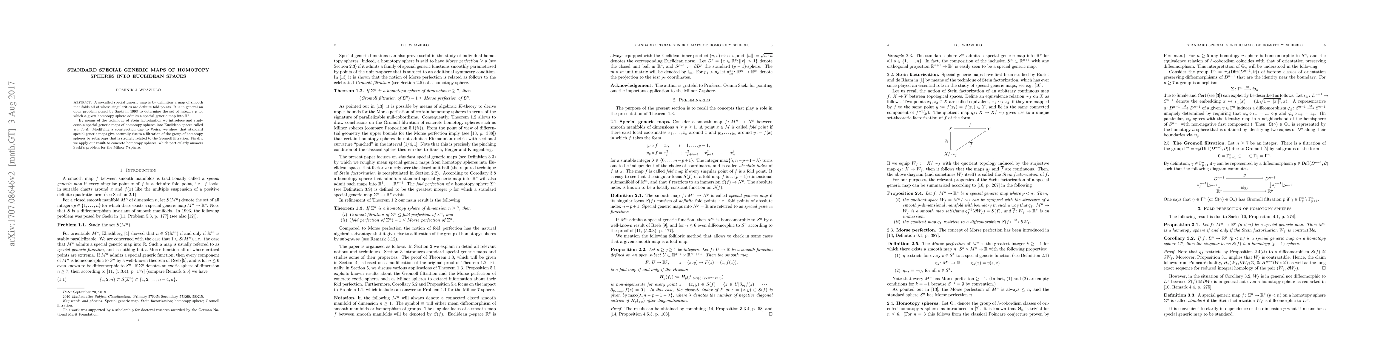 This paper introduces and studies special generic maps of homotopy spheres into Euclidean spaces, termed "standard," and employs Stein factorization to reveal a filtration of homotopy spheres related to the Gromoll filtration. It resolves Saeki's 1993 problem by demonstrating the existence of such maps for the Milnor 7-sphere.
