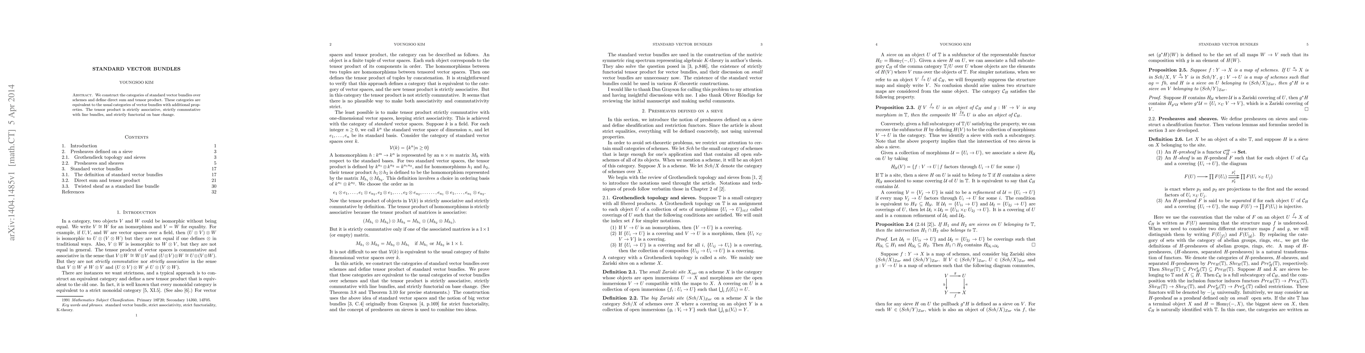 Summary: This paper constructs categories of standard vector bundles over schemes, defining direct sum and tensor product operations, and proves their equivalence to conventional vector bundle categories. The tensor product is shown to be strictly associative, commutative with line bundles, and functorial under base change.