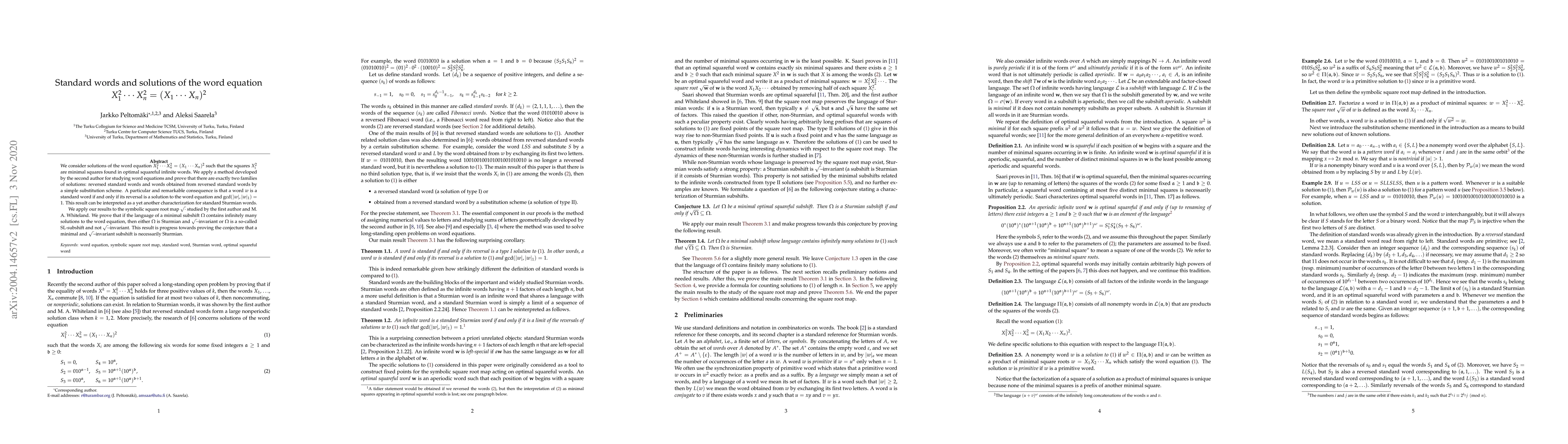 We consider solutions of the word equation $X_1^2 \dotsm X_n^2 = (X_1 \dotsm X_n)^2$ such that the squares $X_i^2$ are minimal squares found in optimal squareful infinite words. We apply a method developed by the second author for studying word equations and prove that there are exactly two families of solutions: reversed standard words and words obtained from reversed standard words by a simple substitution scheme. A particular and remarkable consequence is that a word $w$ is a standard word if and only if its reversal is a solution to the word equation and $\gcd(|w|, |w|_1) = 1$. This result can be interpreted as a yet another characterization for standard Sturmian words. We apply our results to the symbolic square root map $\sqrt{\cdot}$ studied by the first author and M. A. Whiteland. We prove that if the language of a minimal subshift $\Omega$ contains infinitely many solutions to the word equation, then either $\Omega$ is Sturmian and $\sqrt{\cdot}$-invariant or $\Omega$ is a so-called SL-subshift and not $\sqrt{\cdot}$-invariant. This result is progress towards proving the conjecture that a minimal and $\sqrt{\cdot}$-invariant subshift is necessarily Sturmian.