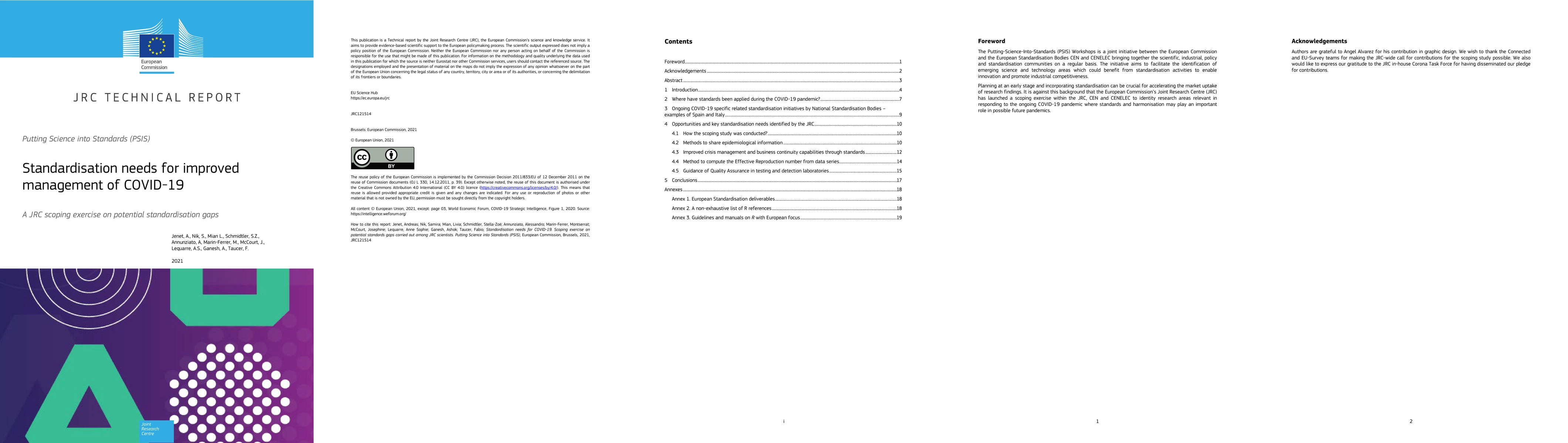 The Joint Research Centre in collaboration with the European standardization bodies CEN and CENELEC launched a scoping exercise on standardization needs in response to COVID-19 and future pandemics. The purpose of the exercise was to identify ongoing harmonization initiatives, as was well as further standardization needs in relevant sectors such as artisanal reusable face masks, medical face masks, and social distancing in closed public or commercial spaces. An overview of already ongoing standardization activities relevant to COVID-19 in Spain and Italy illustrate, although fragmented and partially complete, the importance of standardization in key sectors for combatting pandemics, such as in health, social, safety and security. This report informs colleagues in European institutions and Member States about the crucial role standardization plays in the common efforts to overcome the COVID-19 pandemic. Examples include potential inputs to the drafting of guidelines, methods and or interoperability standards. Finally, the report also provides practical examples of agile standardization activities and deliverables that have the potential to enable the EU to respond more effectively and multilaterally to future crises. With this report we aim to raise awareness about the opportunities that standardization and harmonization can bring in the context of the COVID-19 pandemic.