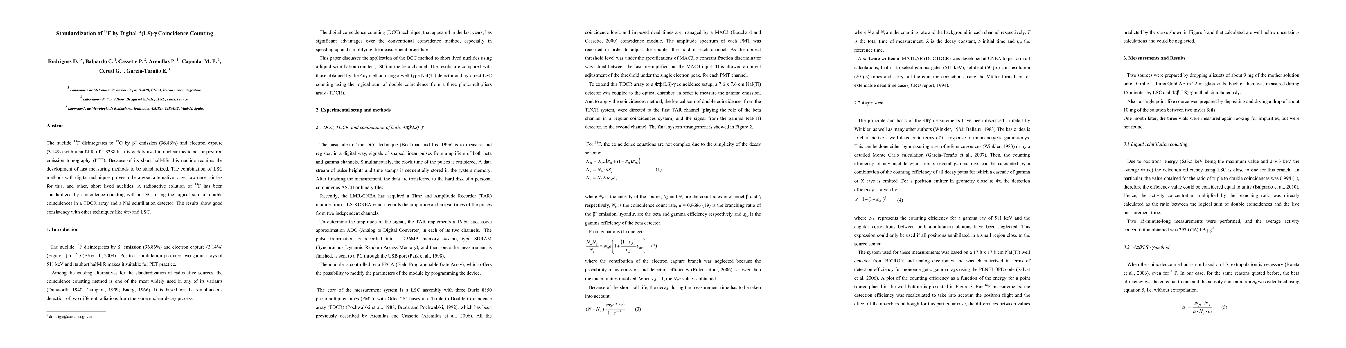Researchers developed a method to standardize 18F using digital beta(LS)-gamma coincidence counting, achieving good consistency with other techniques for this short-lived nuclide used in PET scans.