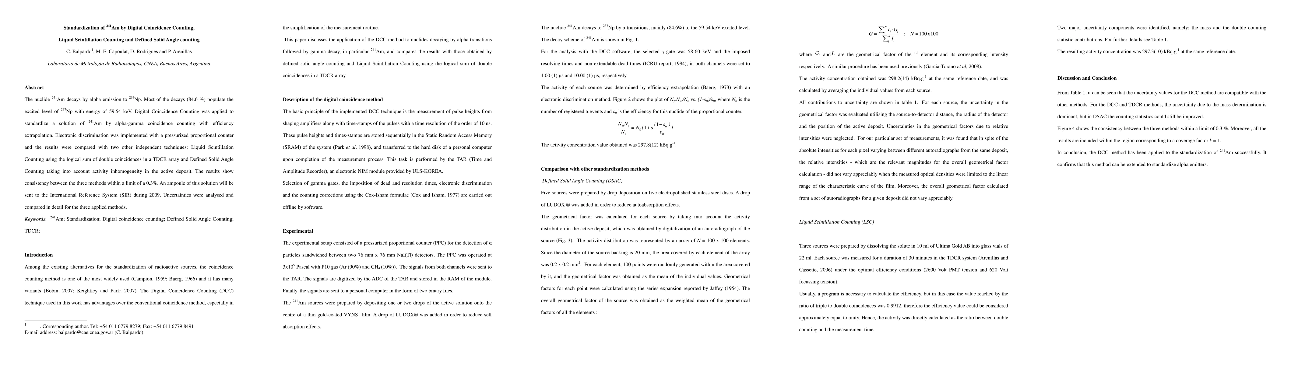 This paper standardizes a 241Am solution using digital coincidence counting, liquid scintillation counting, and defined solid angle counting, showing consistency within 0.3%. The study also details the uncertainties and comparisons among the three methods.