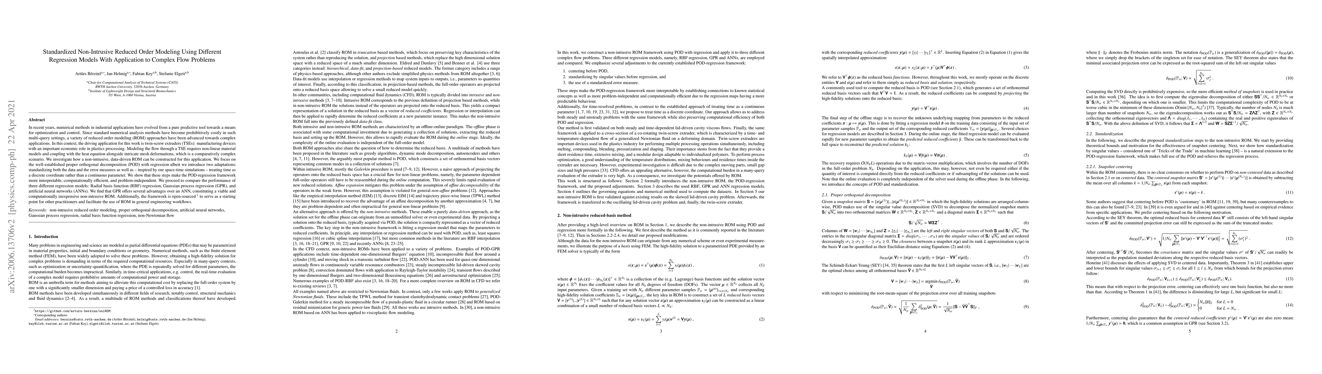 This paper develops a standardized, non-intrusive reduced order modeling (ROM) framework using regression techniques for complex flow problems in twin-screw extruders, emphasizing proper orthogonal decomposition (POD). The authors compare Radial basis function regression, Gaussian process regression, and artificial neural networks, finding Gaussian process regression to be the most efficient and effective for this application.