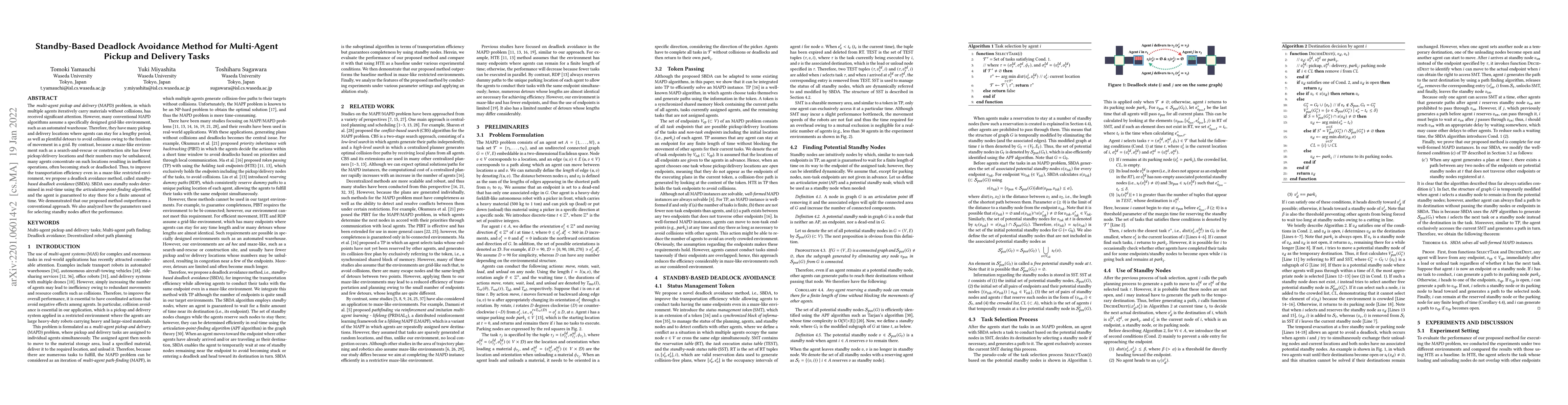 This paper proposes a standby-based deadlock avoidance (SBDA) method for multi-agent pickup and delivery tasks in maze-like environments, addressing inefficiencies and deadlocks. The method uses real-time standby nodes determined via an articulation-point-finding algorithm to improve transportation efficiency.