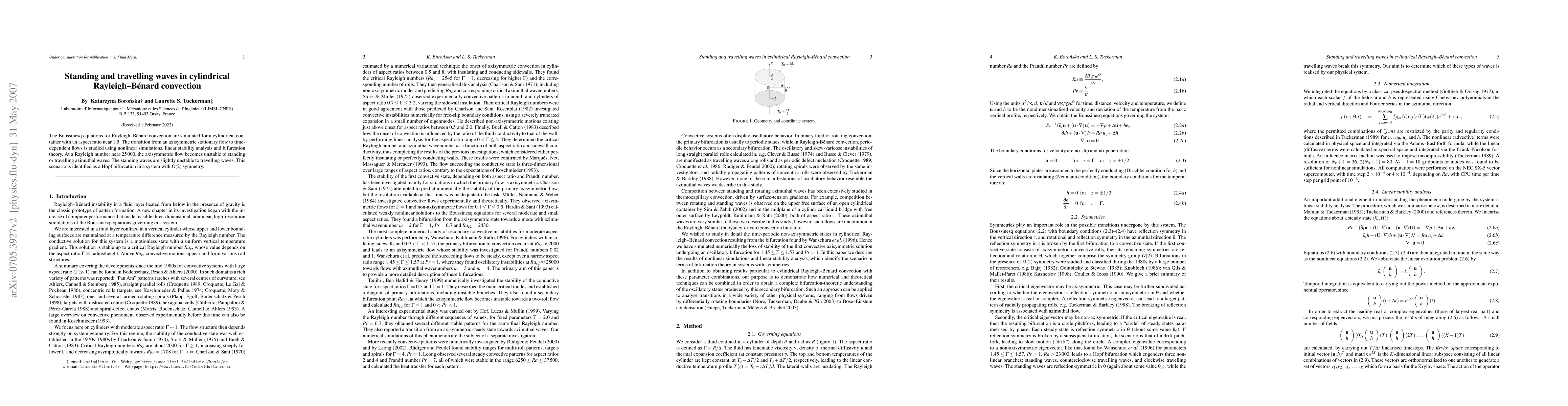 This study simulates Rayleigh-Benard convection in a cylindrical container, revealing a transition to time-dependent flows at a Rayleigh number of around 25,000. The system transitions from axisymmetric stationary flow to standing or travelling azimuthal waves, identified as a Hopf bifurcation with O(2) symmetry.