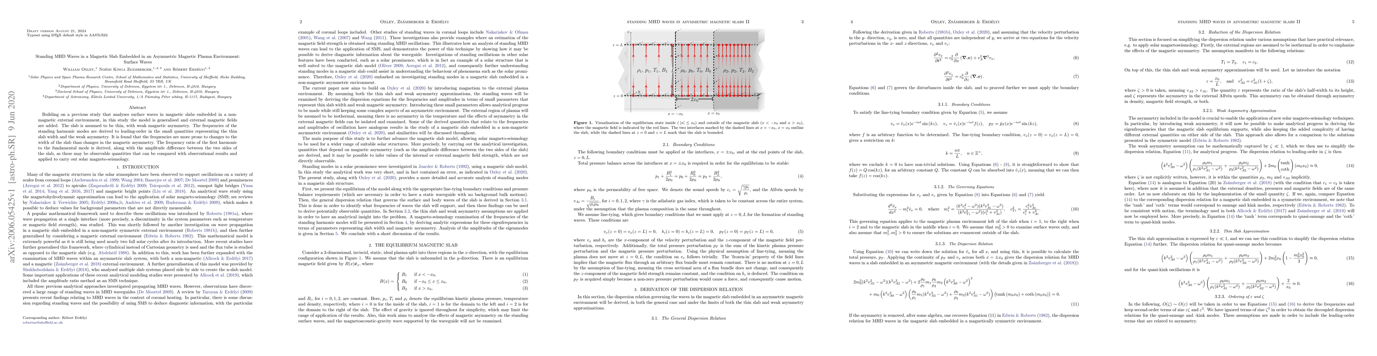 Building on a previous study that analyses surface waves in magnetic slabs embedded in a non-magnetic external environment, in this study the model is generalised and external magnetic fields are added. The slab is assumed to be thin, with weak magnetic asymmetry. The frequencies of the standing harmonic modes are derived to leading-order in the small quantities representing the thin slab width and the weak asymmetry. It is found that the frequencies are more prone to changes to the width of the slab than changes in the magnetic asymmetry. The frequency ratio of the first harmonic to the fundamental mode is derived, along with the amplitude difference between the two sides of the slab, as these may be observable quantities that can be compared with observational results and applied to carry out solar magneto-seismology.