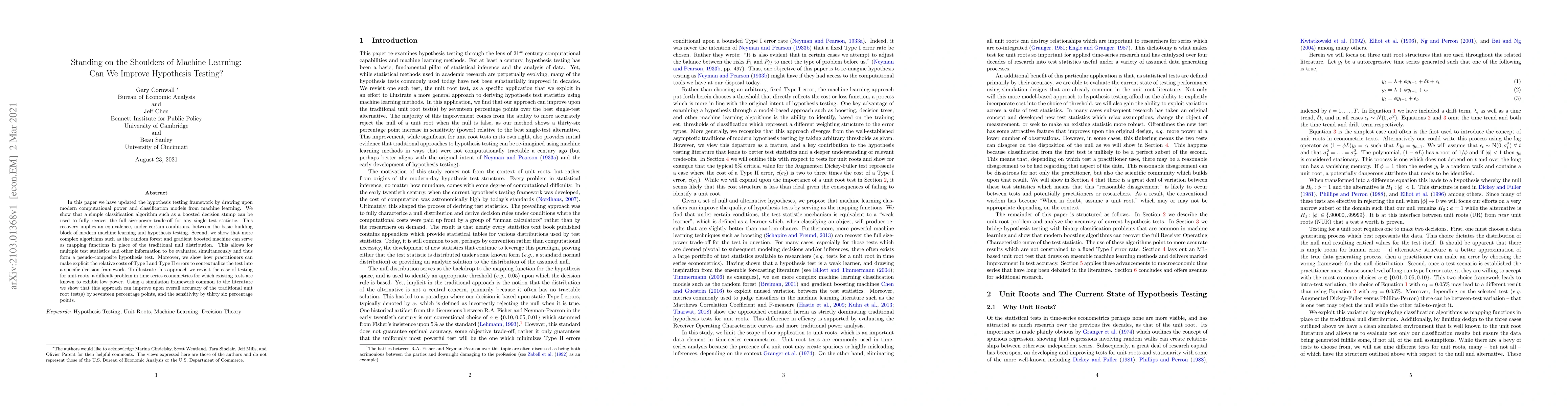 In this paper we have updated the hypothesis testing framework by drawing upon modern computational power and classification models from machine learning. We show that a simple classification algorithm such as a boosted decision stump can be used to fully recover the full size-power trade-off for any single test statistic. This recovery implies an equivalence, under certain conditions, between the basic building block of modern machine learning and hypothesis testing. Second, we show that more complex algorithms such as the random forest and gradient boosted machine can serve as mapping functions in place of the traditional null distribution. This allows for multiple test statistics and other information to be evaluated simultaneously and thus form a pseudo-composite hypothesis test. Moreover, we show how practitioners can make explicit the relative costs of Type I and Type II errors to contextualize the test into a specific decision framework. To illustrate this approach we revisit the case of testing for unit roots, a difficult problem in time series econometrics for which existing tests are known to exhibit low power. Using a simulation framework common to the literature we show that this approach can improve upon overall accuracy of the traditional unit root test(s) by seventeen percentage points, and the sensitivity by thirty six percentage points.