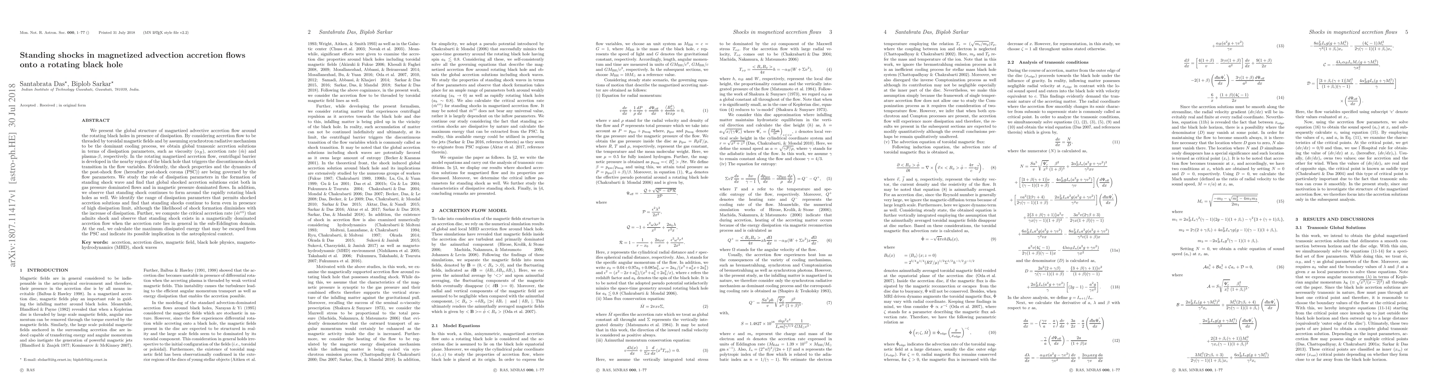 This paper explores the global structure of magnetized advection accretion flows around rotating black holes, focusing on the formation of standing shocks due to centrifugal barriers. It identifies the conditions under which these shocks form, including the influence of dissipation parameters, and finds that shocks can exist in both gas and magnetic pressure-dominated flows, particularly in sub-Eddington accretion rates.