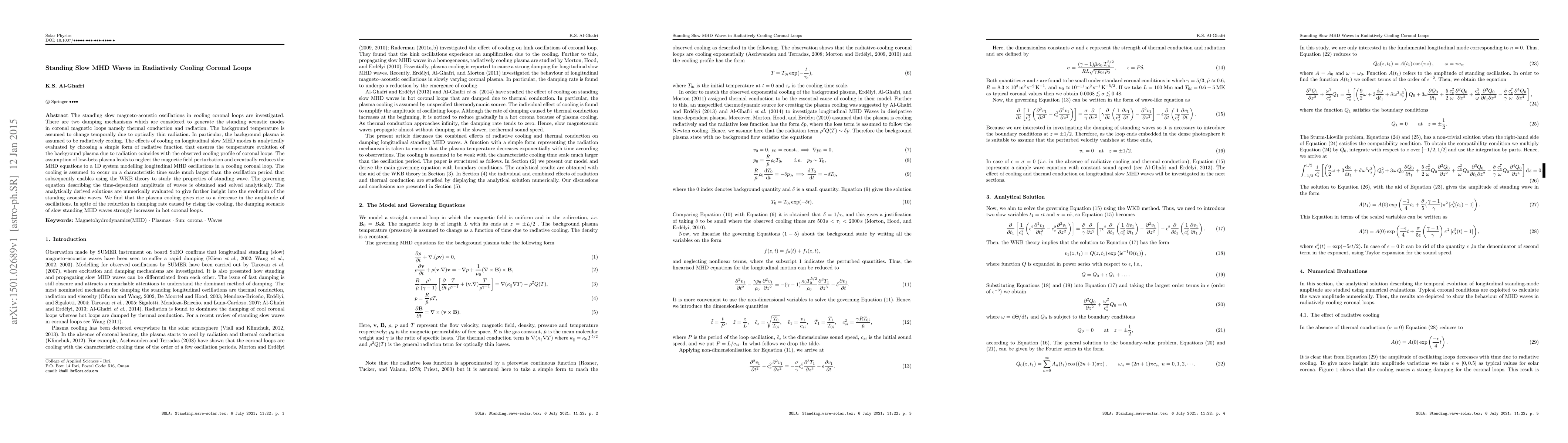 This paper investigates standing slow magneto-acoustic oscillations in radiatively cooling coronal loops, focusing on thermal conduction and radiation as damping mechanisms. Analytical solutions reveal that plasma cooling decreases the amplitude of oscillations, while increasing the damping rate in hot coronal loops.