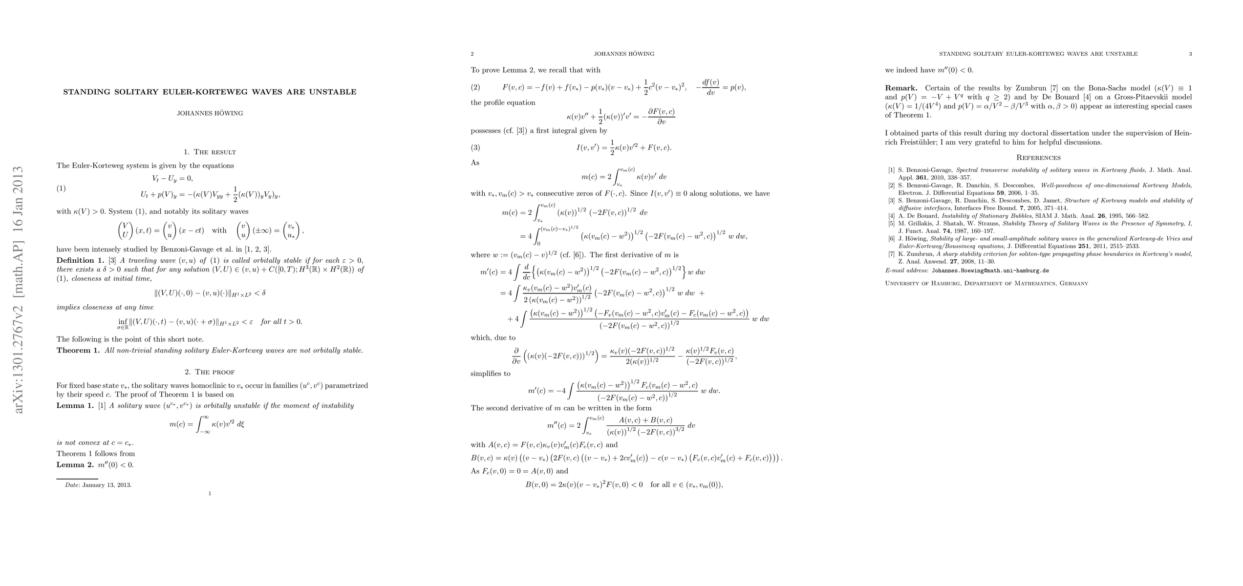 Summary: This paper demonstrates that standing solitary waves in the Euler-Korteweg system are inherently unstable, providing a significant theoretical insight into the dynamics of such fluid-dynamical models. The findings challenge the stability assumptions often made in related studies.