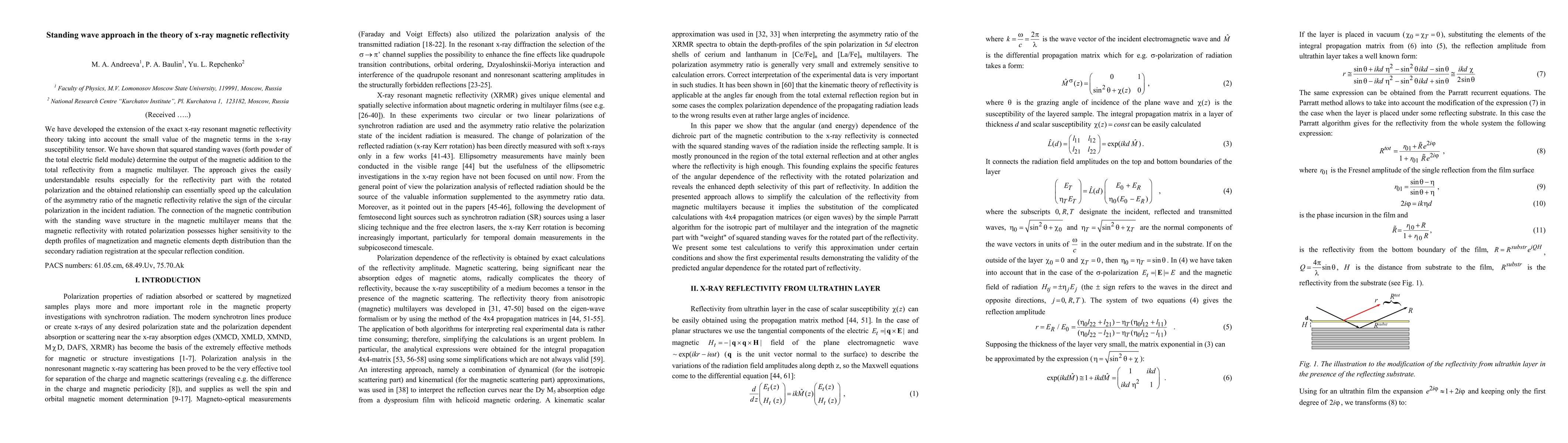 We have developed the extension of the exact x-ray resonant magnetic reflectivity theory taking into account the small value of the magnetic terms in the x-ray susceptibility tensor. We have shown that squared standing waves (forth powder of the total electric field module) determine the output of the magnetic addition to the total reflectivity from a magnetic multilayer. The approach gives the easily understandable results especially for the reflectivity part with the rotated polarization and the obtained relationship can essentially speed up the calculation of the asymmetry ratio of the magnetic reflectivity relative the sign of the circular polarization in the incident radiation. The connection of the magnetic contribution with the standing wave structure in the magnetic multilayer means that the magnetic reflectivity with rotated polarization possesses higher sensitivity to the depth profiles of magnetization and magnetic elements depth distribution than the secondary radiation registration at the specular reflection condition.