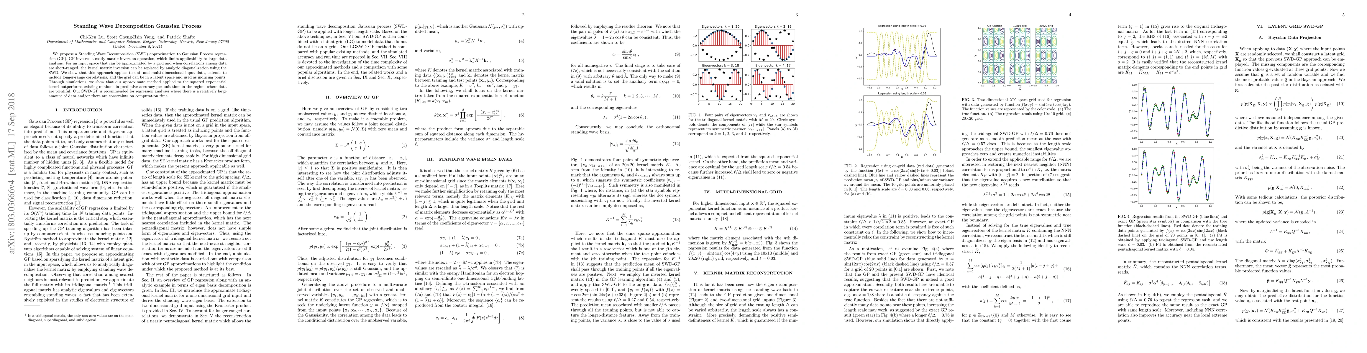 We propose a Standing Wave Decomposition (SWD) approximation to Gaussian Process regression (GP). GP involves a costly matrix inversion operation, which limits applicability to large data analysis. For an input space that can be approximated by a grid and when correlations among data are short-ranged, the kernel matrix inversion can be replaced by analytic diagonalization using the SWD. We show that this approach applies to uni- and multi-dimensional input data, extends to include longer-range correlations, and the grid can be in a latent space and used as inducing points. Through simulations, we show that our approximate method applied to the squared exponential kernel outperforms existing methods in predictive accuracy per unit time in the regime where data are plentiful. Our SWD-GP is recommended for regression analyses where there is a relatively large amount of data and/or there are constraints on computation time.