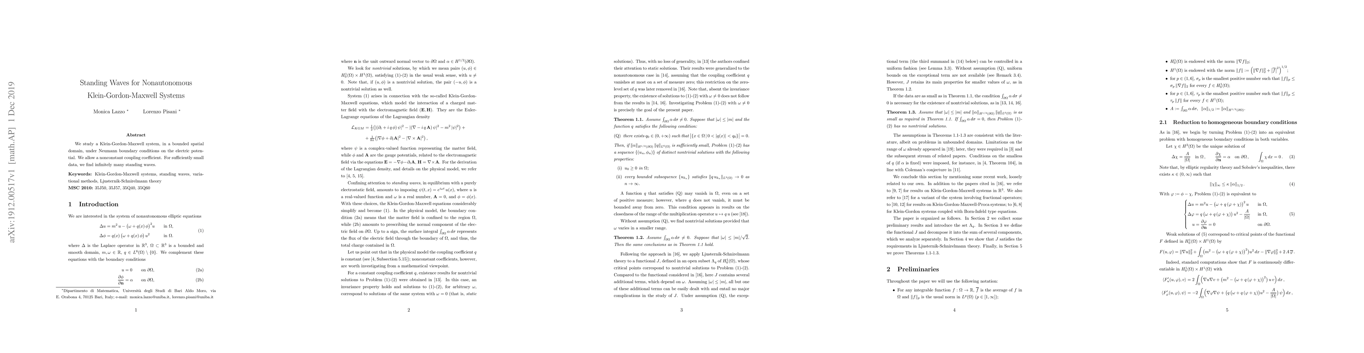 Summary: This research investigates standing waves in a nonautonomous Klein-Gordon-Maxwell system with Neumann boundary conditions and a variable coupling coefficient, revealing the existence of infinitely many standing waves for small initial data.
