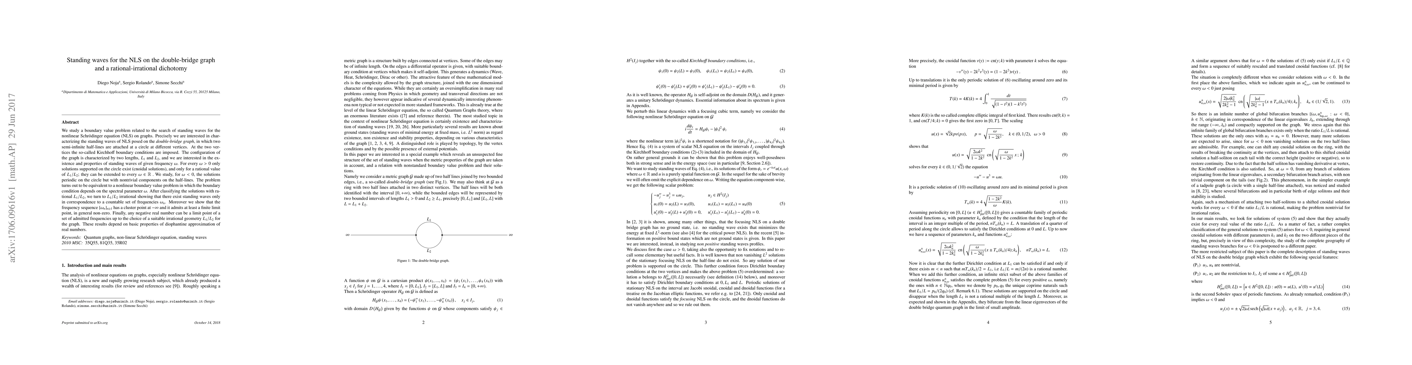 We study a boundary value problem related to the search of standing waves for the nonlinear Schr\"odinger equation (NLS) on graphs. Precisely we are interested in characterizing the standing waves of NLS posed on the {\it double-bridge graph}, in which two semi-infinite half-lines are attached at a circle at different vertices. At the two vertices the so-called Kirchhoff boundary conditions are imposed. The configuration of the graph is characterized by two lengths, $L_1$ and $L_2$, and we are interested in the existence and properties of standing waves of given frequency $\omega$. For every $\omega>0$ only solutions supported on the circle exist (cnoidal solutions), and only for a rational value of $L_1/L_2$; they can be extended to every $\omega\in \mathbb{R}$. We study, for $\omega<0$, the solutions periodic on the circle but with nontrivial components on the half-lines. The problem turns out to be equivalent to a nonlinear boundary value problem in which the boundary condition depends on the spectral parameter $\omega$. After classifying the solutions with rational $L_1/L_2$, we turn to $L_1/L_2$ irrational showing that there exist standing waves only in correspondence to a countable set of frequencies $\omega_n$. Moreover we show that the frequency sequence $\{\omega_n\}_{n \geq 1}$ has a cluster point at $-\infty$ and it admits at least a finite limit point, in general non-zero. Finally, any negative real number can be a limit point of a set of admitted frequencies up to the choice of a suitable irrational geometry $L_1/L_2$ for the graph. These results depend on basic properties of diophantine approximation of real numbers.